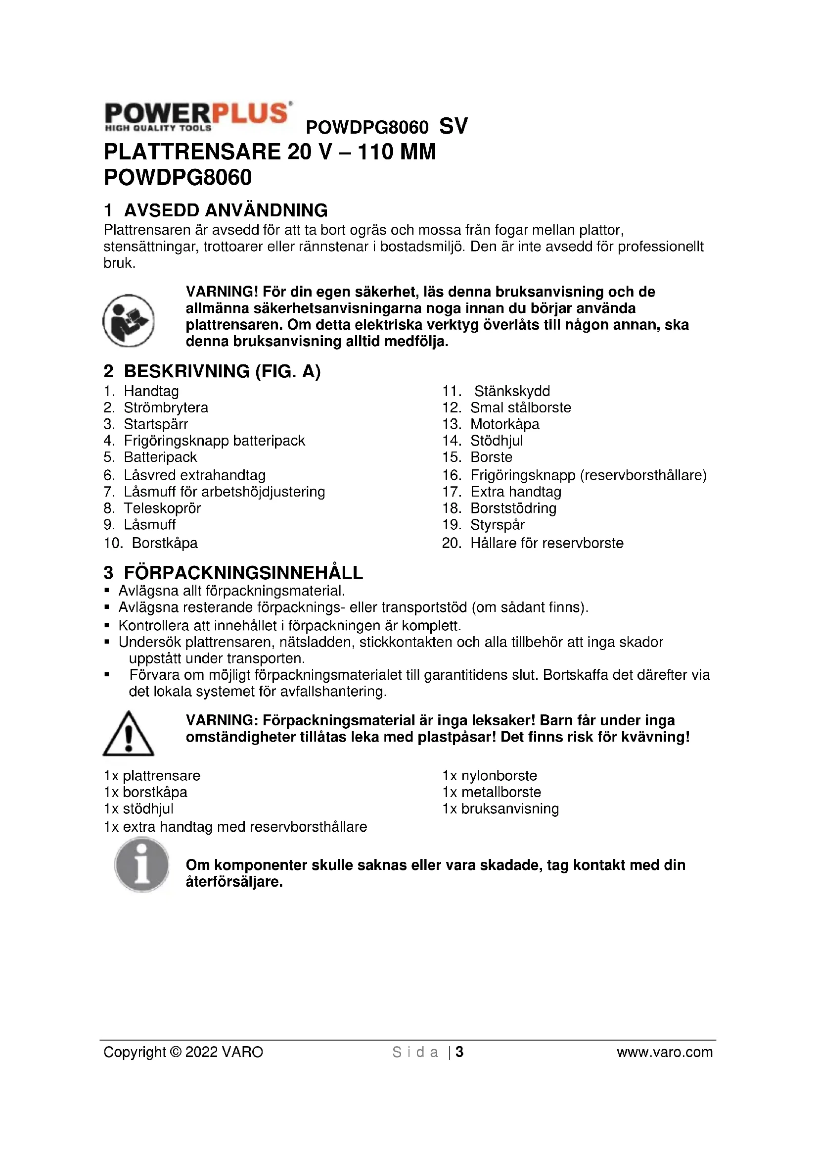 - Absolut undantagna från garantin är skador uppkomna genom vätska som trängt in, överdrivet utsättande för damm, medveten skada (avsiktlig eller genom grov vårdslöshet), olämplig användning (användning för ändamål för vilka plattrensaren inte lämpar sig),POWDPG8060 SV Copyright © 2022 VARO S i d a | 12 www.varo.com okunnig användning (t.ex. utan att respektera i denna bruksanvisning givna anvisningar), osakkunnig montering, blixtnedslag, felaktig nätspänning. Denna uppräkning gör inte anspråk på att vara fullständig.