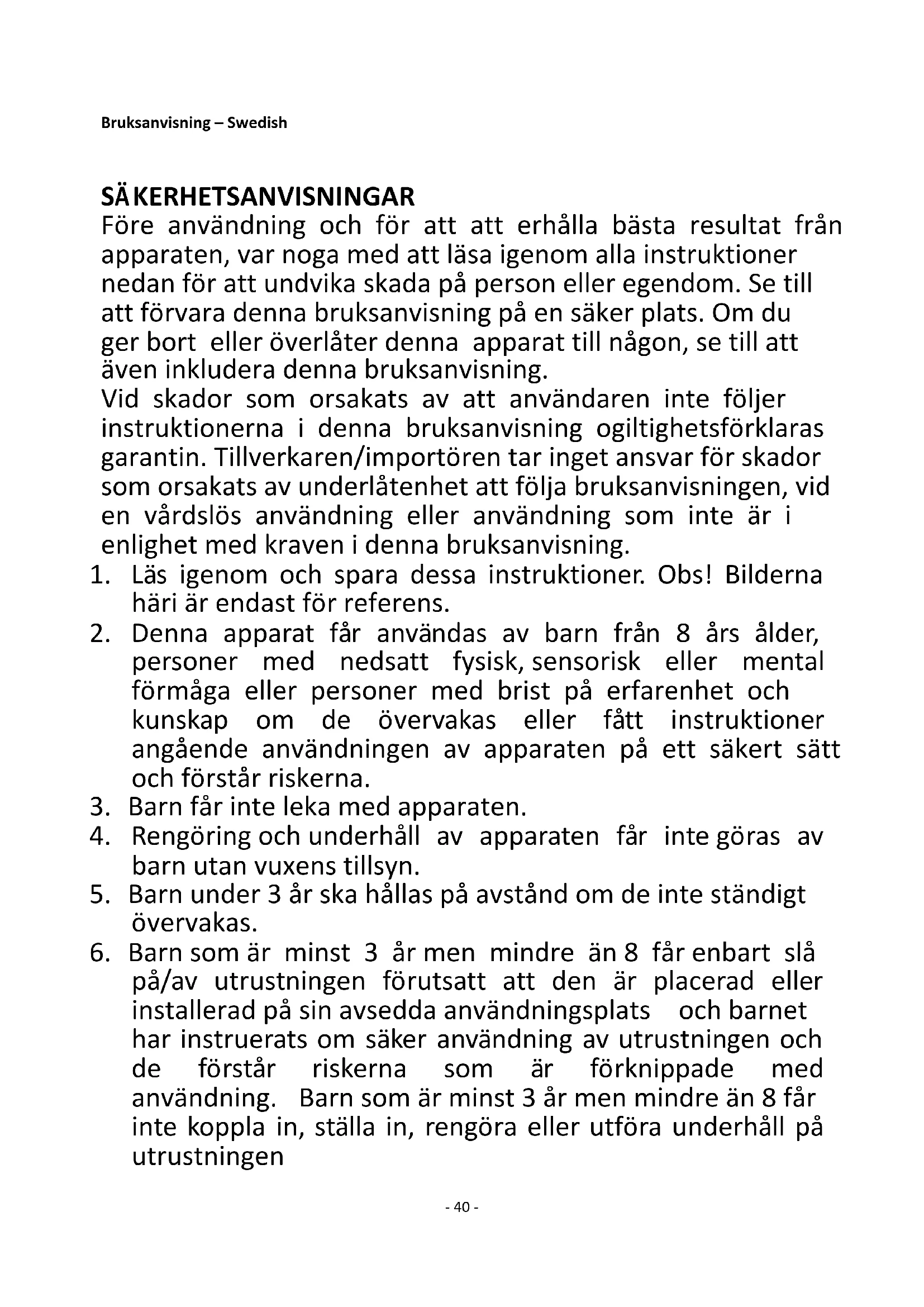 Satisfait aux exigences des Directives du Conseil : Règlement (UE) n° 2015/1188 de la Commission du 28 avril 2015 et amendé par le règlement (UE) n° 2016/2282 de la Commission portant application de la directive 2009/125/CE du Parlement européen et du Conseil en ce qui concerne les exigences d'écoconception des dispositifs de chauffage décentralisés. En ce qui concerne les informations pour les consommateurs sur comment installer, utiliser et entretenir le produit, les informations DEEE, consultez le manuel d’instruction fourni avec l’emballage.- 40 - Bruksanvisning – Swedish SÄKERHETSANVISNINGAR Före användning och för att att erhålla bästa resultat från apparaten, var noga med att läsa igenom alla instruktioner nedan för att undvika skada på person eller egendom. Se till att förvara denna bruksanvisning på en säker plats. Om du ger bort eller överlåter denna apparat till någon, se till att även inkludera denna bruksanvisning. Vid skador som orsakats av att användaren inte följer instruktionerna i denna bruksanvisning ogiltighetsförklaras garantin. Tillverkaren/importören tar inget ansvar för skador som orsakats av underlåtenhet att följa bruksanvisningen, vid en vårdslös användning eller användning som inte är i enlighet med kraven i denna bruksanvisning.