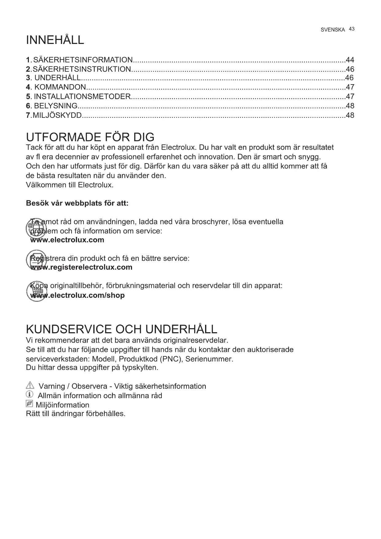Vi rekommenderar att det bara används originalreservdelar. Se till att du har följande uppgifter till hands när du kontaktar den auktoriserade serviceverkstaden: Modell, Produktkod (PNC), Serienummer. Du hittar dessa uppgifter på typskylten. Varning / Observera - Viktig säkerhetsinformation Allmän information och allmänna råd Miljöinformation Rätt till ändringar förbehålles. SVENSKA44 www.electrolux.com