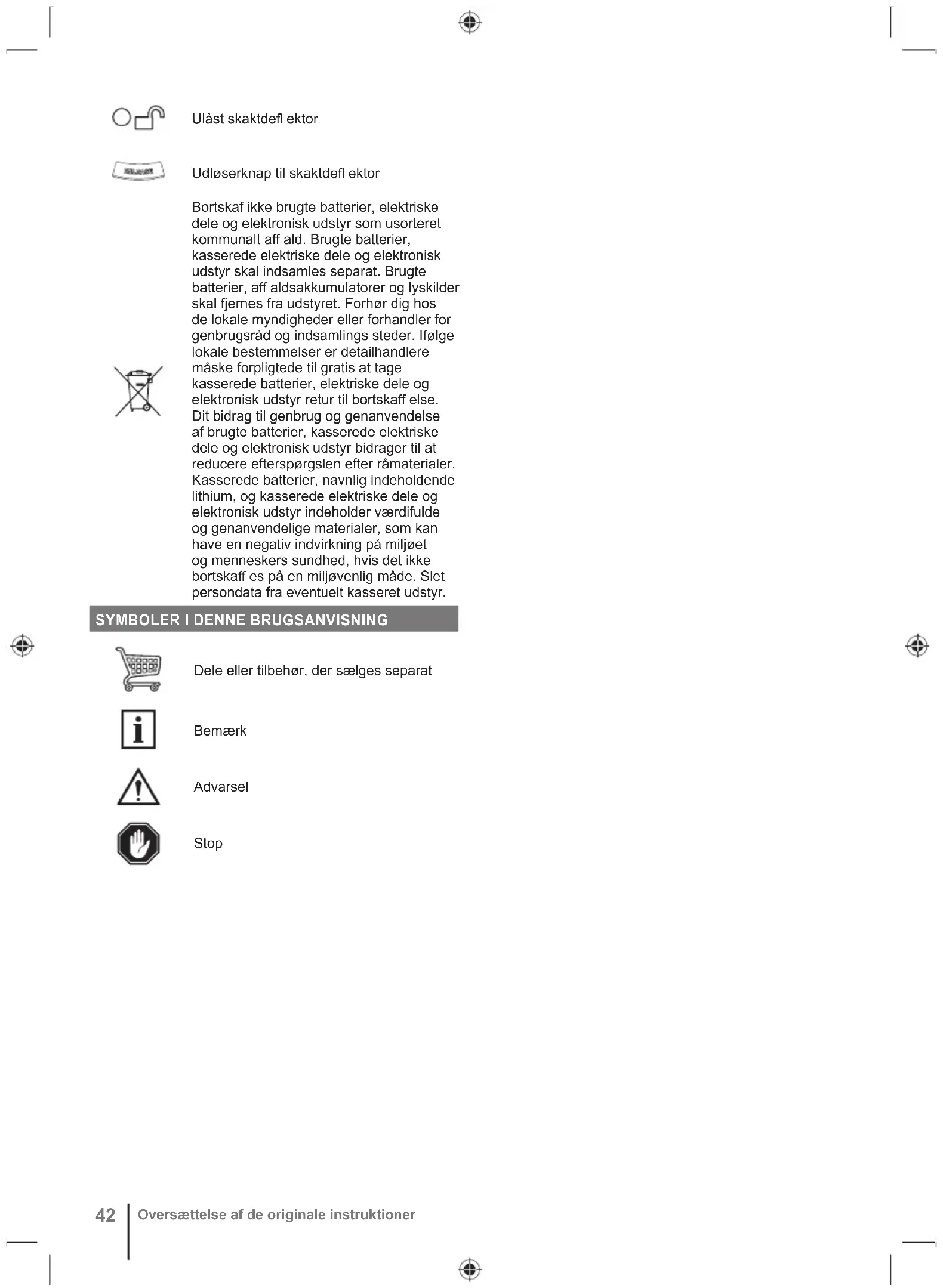 Översättning av de ursprungliga instruktionernaKassera inte uttjänta batterier, elavfall och elektronisk utrustning som restavfall. Uttjänta batterier, elavfall och elektronisk utrustning måste samlas in separat. Uttjänta batterier, uttjänta ackumulatorer och ljuskällor måste avlägsnas från utrustningen. Hör med din lokala myndighet eller din återförsäljare om råd för återvinning och insamlingsstation. Beroende på lokala bestämmelser kan återförsäljare vara skyldiga att kostnadsfritt ta tillbaka uttjänta batterier samt elektriskt och elektroniskt avfall. Ditt bidrag till återanvändning och återvinning av uttjänta batterier samt elektriskt och elektroniskt avfall bidrar till att minska behovet av råmaterial. Uttjänta batterier, särskilt litiumbatterier, samt elavfall och elektronisk utrustning innehåller värdefulla och återvinningsbara material som kan påverka miljön och människors hälsa negativt, om de inte kasseras på ett miljömässigt sätt. Radera eventuella personuppgifter från avfallsutrustningen.