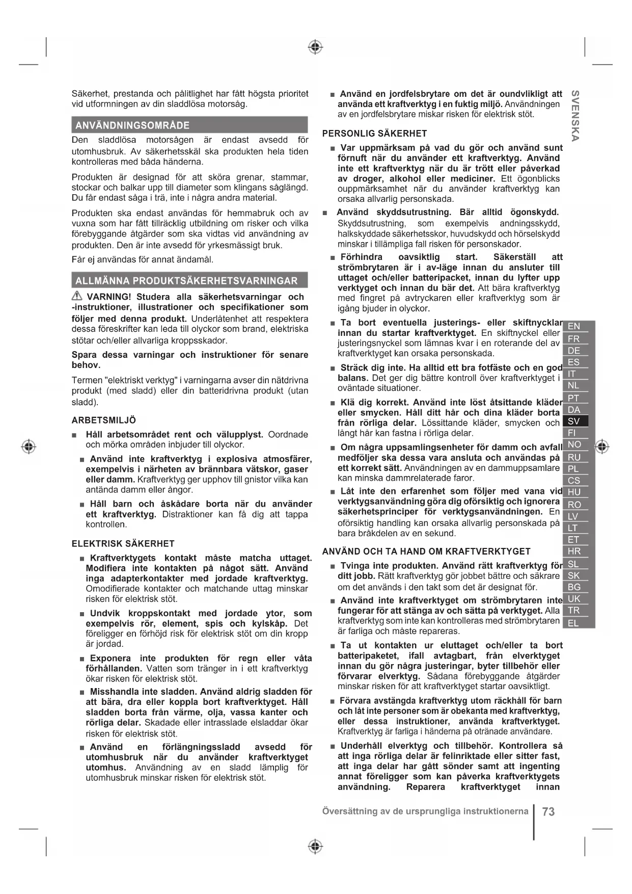 MOTORSÅG ■ Håll alla kroppsdelar på säkert avstånd från klingan när motorsågen är i gång. Innan du startar motorsågen ska du kontrollera att klingan inte vidrör något. Ett ögonblick med bristande uppmärksamhet vid användning av motorsåg kan göra att kläder eller kroppsdelar kommer in i sågklingan. ■ Håll alltid motorsågen med höger hand på bakre handtaget och vänster hand på det främre. Om du håller motorsågen med omvänd fattning ökar risken för personskada. Undvik detta alltid. ■ Håll endast motorsågen i de isolerade greppytorna, eftersom sågkedjan kan komma i kontakt med dolda ledningar eller dess egen kabel. Sågblad som vidrör en "strömförande" ledning kan göra att motorsågens exponerade metalldelar blir "strömförande" och kan leda till att användaren drabbas av en elstöt. ■ Bär ögonskydd Ytterligare skyddsutrustning för hörsel, huvud, händer, ben och fötter rekommenderas. Adekvat skyddsutrustning kommer att minska risken för personskador orsakade av flygande skräp eller oavsiktlig kontakt med sågkedjan. ■ Använd inte en motorsåg i ett träd, på en stege, på ett hustak eller vid ostabila förhållanden. Att använda en motorsåg på det här sättet kan resultera i allvarlig personskada. ■ Se till att alltid stå stadigt och använd enbart motorsågen när du står på fast, säkert och jämnt underlag. Hala eller ostabila ytor kan göra att du tappar balansen eller kontrollen över motorsågen. ■ Vid kapning av grenar som är belastade ska du vara beredd på att den kan fjädra tillbaka. När spänningen i träfibrerna lossas kan den belastade grenen slå till användaren och/eller kasta iväg motorsågen. ■ Var extremt försiktig när du kapar buskar och skott. Det tunnare materialet kan fastna i kedjan och piska till mot dig eller dra dig ur balans. ■ Bär motorsågen i främre handtaget med motorsågen avslagen och håll den borta från kroppen. Vid transport eller förvaring av motorsågen ska alltid sågskyddet vara på. Korrekt hantering av motorsågen minskar risken för beröring av misstag med sågklingan i rörelse. ■ Följ anvisningar för smörjning, kedjespänning och utbyte av stång och kedja. Felaktigt spänd eller smord kedja kan antingen gå av eller öka risken för bakslag. ■ Kapa enbart trä. Använd inte motorsågen för annat än avsett. Exempelvis: använd inte en motorsåg för skärning av metall, plast, byggnadssten eller byggnadsmaterial som inte är av trä. Användning av motorsågen för saker som den inte är avsedd för kan leda till riskfyllda situationer. ■ Försök inte fälla ett trä förrän du har en förståelse för riskerna och hur du undviker dem. Allvarlig skada kan inträffa hos operatören eller hos personerna i närheten vid fällningen av ett träd. ■ Följ alla instruktioner vid avlägsning av material som sitter fast, vid förvaring eller vid underhåll av enheten. Försäkra dig om att strömbrytaren är avstängd och att batteripaketet har tagits ut. Oväntad igångsättning av motorsågen vid avlägsning av material som sitter fast eller vid underhåll kan resultera i allvarlig personskada. ORSAKER OCH FÖRHINDRAN AV BAKSLAG: Ett kast kan uppstå när spetsen på svärdet rör vid ett föremål eller om kedjan kilas fast i träet under arbetet. Vidröring med spetsen kan orsaka en plötslig omvänd reaktion, slå klingan bakåt och uppåt mot användaren.SVENSKA