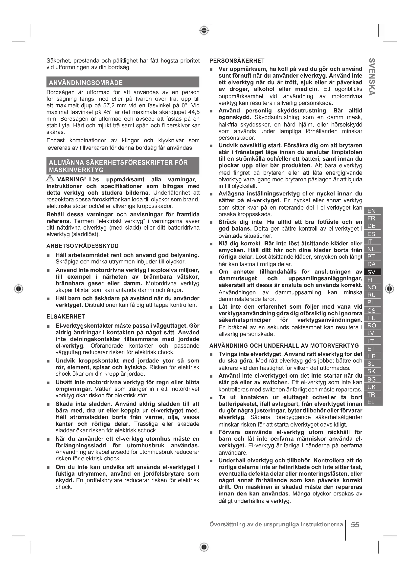 EL■ Håll skärverktyg vassa och rena. Korrekt underhålla skärverktyg med vassa kanter är mindre benägna att fastna och lättare att kontrollera. ■ Använd elverktyget, tillbehör och insatsverktyg mm. i enlighet med dessa anvisningar, och anpassat till arbetsförhållandena och det arbete som ska utföras. Användning av el-verktyget för andra områden än de avsedda kan resultera i en riskfylld situation. ■ Håll handtag och greppytor torra, rena och fria från olja och smörjfett. Hala handtag och greppytor tillåter inte säker hantering och kontroll av verktyget i oväntade situationer.