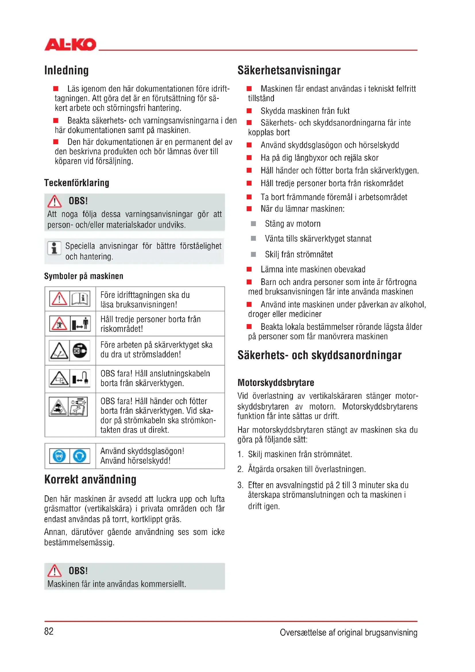 EU-direktiver 2006/42/EG 2014/30/EU 2000/14/EG 2011/65/EU 2014/35/EU Harmoniserede standarder EN 60335-1:2002+A1+A11+A12+A2+A13 EN 13684+A3 EN 60335-2-92 Lydeffektniveau målt / garanteret EN ISO 3744 98 / 99 dB(A) Overensstemmelsesvur- dering 2000/14/EG Bilag V Kötz,01.07.2016WolfgangHergeth,ManagingDirector82 Oversættelse af original brugsanvisning Inledning Läs igenom den här dokumentationen före idrift- tagningen. Att göra det är en förutsättning för sä- kert arbete och störningsfri hantering. Beakta säkerhets- och varningsanvisningarna i den här dokumentationen samt på maskinen. Den här dokumentationen är en permanent del av den beskrivna produkten och bör lämnas över till köparen vid försäljning. Teckenförklaring OBS! Att noga följa dessa varningsanvisningar gör att person- och/eller materialskador undviks. Speciella anvisningar för bättre förståelighet och hantering. Symboler på maskinen Före idrifttagningen ska du läsa bruksanvisningen! Håll tredje personer borta från riskområdet! Före arbeten på skärverktyget ska du dra ut strömsladden! OBS fara! Håll anslutningskabeln borta från skärverktygen. OBS fara! Håll händer och fötter borta från skärverktygen. Vid ska- dor på strömkabeln ska strömkon- takten dras ut direkt. Använd skyddsglasögon! Använd hörselskydd! Korrekt användning Den här maskinen är avsedd att luckra upp och lufta gräsmattor (vertikalskära) i privata områden och får endast användas på torrt, kortklippt gräs. Annan, därutöver gående användning ses som icke bestämmelsemässig. OBS! Maskinen får inte användas kommersiellt. Säkerhetsanvisningar Maskinen får endast användas i tekniskt felfritt tillstånd Skydda maskinen från fukt Säkerhets- och skyddsanordningarna får inte kopplas bort Använd skyddsglasögon och hörselskydd Ha på dig långbyxor och rejäla skor Håll händer och fötter borta från skärverktygen. Håll tredje personer borta från riskområdet Ta bort främmande föremål i arbetsområdet När du lämnar maskinen: Stäng av motorn Vänta tills skärverktyget stannat Skilj från strömnätet Lämna inte maskinen obevakad Barn och andra personer som inte är förtrogna med bruksanvisningen får inte använda maskinen Använd inte maskinen under påverkan av alkohol, droger eller mediciner Beakta lokala bestämmelser rörande lägsta ålder på personer som får manövrera maskinen Säkerhets- och skyddsanordningar Motorskyddsbrytare Vid överlastning av vertikalskäraren stänger motor- skyddsbrytaren av motorn. Motorskyddsbrytarens funktion får inte sättas ur drift. Har motorskyddsbrytaren stängt av maskinen ska du göra på följande sätt: