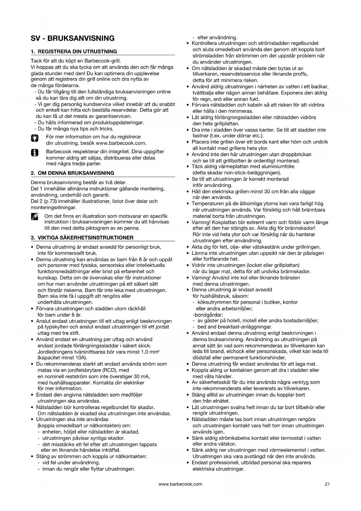 Tack för att du köpt en Barbecook-grill. Vi hoppas att du ska tycka om att använda den och får många glada stunder med den! Du kan optimera din upplevelse genom att registrera din grill online och dra nytta av de många fördelarna. - Du får tillgång till den fullständiga bruksanvisningen online så du kan lära dig allt om din utrustning. - Vi ger dig personlig kundservice vilket innebär att du snabbt och enkelt kan hitta och beställa reservdelar. Detta gör att du kan få ut det mesta av garantiservicen. - Du hålls informerad om produktuppdateringar. - Du får många nya tips och tricks. För mer information om hur du registrerar din utrustning, besök www.barbecook.com. Barbecook respekterar din integritet. Dina uppgifter kommer aldrig att säljas, distribueras eller delas med några tredje parter.