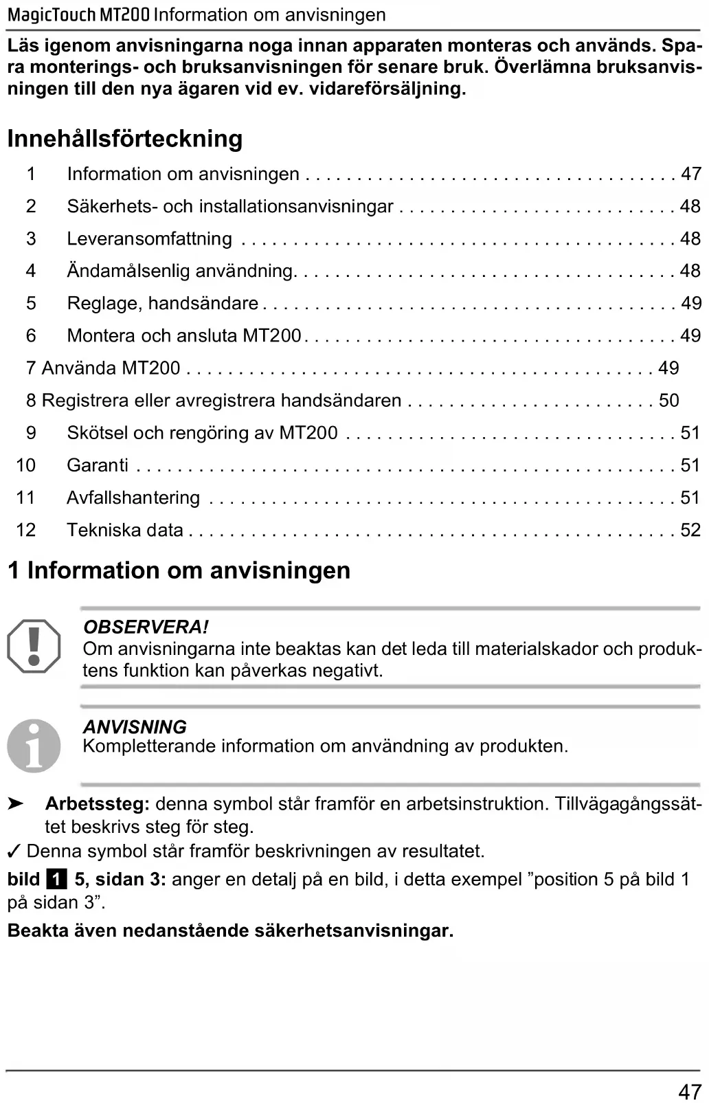 ANVISNING Kompletterande information om användning av produkten. ➤ Arbetssteg: denna symbol står framför en arbetsinstruktion. Tillvägagångssät- tet beskrivs steg för steg. ✓ Denna symbol står framför beskrivningen av resultatet. bild 1 5, sidan 3: anger en detalj på en bild, i detta exempel ”position 5 på bild 1 på sidan 3”. Beakta även nedanstående säkerhetsanvisningar. _MT200.book Seite 47 Freitag, 8. April 2011 3:14 15Säkerhets- och installationsanvisningar MagicTouch MT200