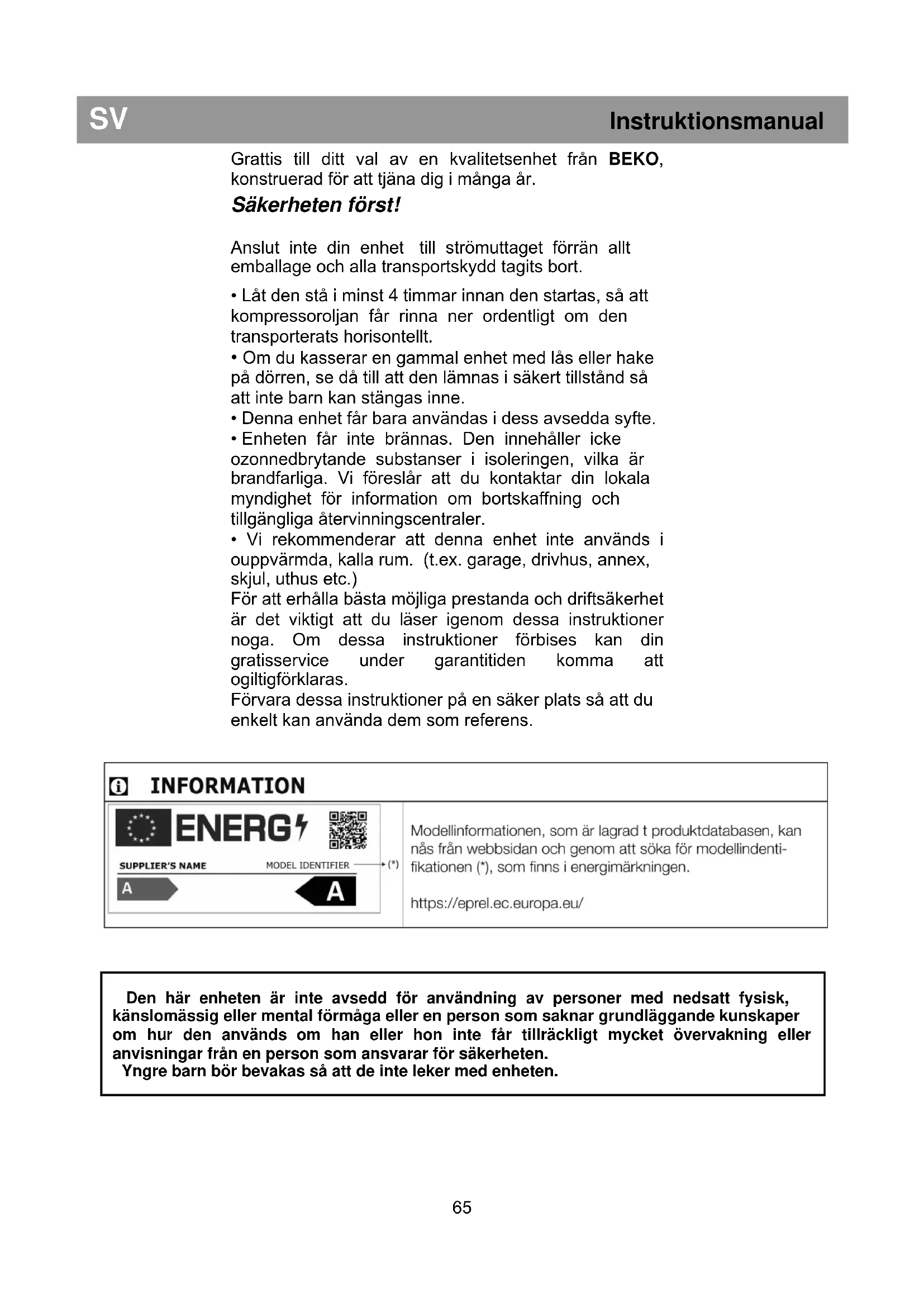 Den här enheten är inte avsedd för användning av personer med nedsatt fysisk, känslomässig eller mental förmåga eller en person som saknar grundläggande kunskaper om hur den används om han eller hon inte får tillräckligt mycket övervakning eller anvisningar från en person som ansvarar för säkerheten. Yngre barn bör bevakas så att de inte leker med enheten.SV Instruktionsmanual Elektriska krav Innan du sätter i väggkontakten bör du kontrollera att spänningen och frekvensen på klassificeringsplåten inuti enheten motsvarar ditt nät. Vi rekommenderar att denna enhet ansluts till huvudledningen via en korrekt kopplad och säkrad kontakt på en lättåtkomlig plats. Varning! Denna enhet måste jordas. Reparation av elektrisk utrustning bör endast utföras av en kvalificerad tekniker. Felaktigt utförda reparationer av en okvalificerad person medför risk för kritiska konsekvenser för den som använder enheten. OBSERVERA! Den här enheten drivs med R600a som är en miljöanpassad, men antändbar gas. Under transport och fixering av produkten måste du iaktta försiktighet så att du inte skadar kylsystemet. Om kylsystemet skadas och det uppstår en gasläcka ska du hålla produkten på avstånd från öppen eld och vädra rummet en stund. VARNING - Använd inte mekaniska enheter eller andra sätt för att snabba på avfrostningsprocessen, förutom det som rekommenderas av tillverkaren. VARNING - Skada inte kylningskretsen. VARNING - Använd inga elektriska enheter inuti enhetens förvaringsutrymmen för mat, såvida dessa inte rekommenderats av tillverkaren. VARNING - Om huvudledningen är skadad måste den bytas av tillverkaren, tillverkarens serviceagent eller motsvarande kvalificerad person, för att fara skall undvikas. Transportinstruktioner