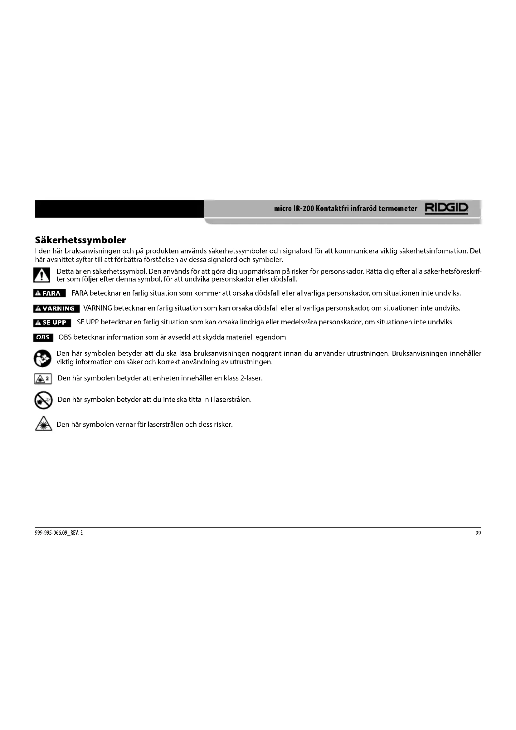OBS Den här utrustningen används för att utföra temperaturmät- ningar. Felaktig användning kan orsaka felaktiga eller onoggranna mätningar. Det är användarens ansvar att välja lämplig mätmetod beroende på gällande förhållanden. Laserklassificering RIDGID micro IR-200 genererar en synlig laserstråle från enhetens framsida. Enheten uppfyller kraven på klass 2-lasrar enligt: IEC 60825-1:2007 FCC-information Den här utrustningen har testats och befunnits överensstämma med gränsvärdena för digitala enheter i klass B, i enlighet med del 15 i FCC:s bestämmelser. Dessa gränser är avsedda att säkerställa rimligt skydd mot skadliga störningar vid installation i bostäder. Den här utrustningen genererar, använder och kan avge radio- frekvensenergi, och om utrustningen inte installeras och används i enlighet med anvisningarna kan den orsaka skadliga störningar i samband med radiokommunikation. Det ges dock ingen garanti för att det inte kan förekomma skadliga störningar i en viss installation. Om den här utrustningen stör mottagningen i en radio- eller tv- apparat (vilket kan upptäckas genom att utrustningen stängs av och slås på), rekommenderar vi att användaren försöker motverka störningen genom att vidta en eller era av följande åtgärder: