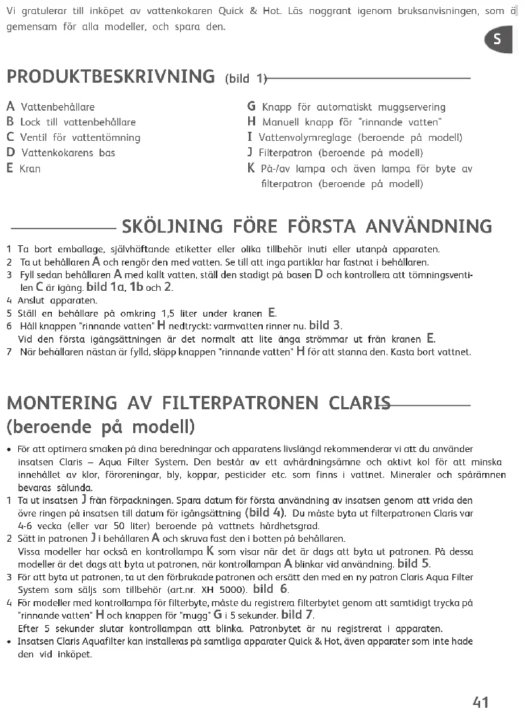 1 Anslut apparaten. 2 Ta av locket B, ta ur vattenbehållaren A och fyll den med kallt vatten. Bild 1a och b. 3 Sätt tillbaka behållaren med en bestämd tryckning och sätt på locket B igen. bild 2. 4 Ställ önskat kärl under kranen E. bild 8. 5 Håll knappen "rinnande vatten" H nedtryckt så får du omedelbart hett vatten. bild 3. Håll den nedtryckt tills du har fått lämplig mängd vatten. När du släpper knappen slutar det varma vattnet att rinna. 6 Du kan också använda knappen för automatiskt muggservering, som har en förinställd mängd vatten. Tryck i så fall kort på knappen G. Apparaten häller då omedelbart ut vattenmängden för en mugg och stannar sedan automatiskt. Om du vill stoppa vattnet före cykelns slut, tryck åter på samma autoknapp G. bild 8. 7 Modeller med vattenvolymreglage ger dig ytterligare en funktion: du kan nämligen ställa in en automatiskt utdelad mängd vatten för ditt kärl. För att göra det, välj önskad kapacitet med reglage I i förhållande till ditt kärl och tryck sedan på den förprogrammerade knappen G, så stannar vattenflödet automatiskt. bild 9. 8 När denna cykel är avslutad, sätt tillbaka insatsen Claris. Apparaten är nu åter färdig att användas. bild 6. AVKALKNING av apparaten För att optimera apparatens livslängd råder vi dig att avkalka apparaten minst en gång varannan månad. Ännu oftare om vattnet är mycket kalkhaltigt. Så här gör du: 1 Ta ut insatsen Claris. bild 6. 2 Ställ en behållare på ca. 1,5 liter under kranen. 3 Töm behållaren A om den ännu är fylld med vatten och ställ sedan tillbaka den på sin bas. bild 2. 4 Häll 1 liter ättika (8 %) i behållaren. 5 Tryck samtidigt på knappen "rinnande vatten" H och knappen ”mugg” G i minst 10 sekunder. bild 7. 6 Avkalkningscykeln går igång automatiskt och håller på i ca. 10 minuter. 7 När cykeln är avslutad, töm behållaren och fyll den åter med maximal mängd vatten. Sätt i gång en ny omgång för sköljning av apparaten genom att trycka på knappen "rinnande vatten" H. bild 3. 8 När denna cykel är avslutad, sätt tillbaka insatsen Claris. Apparaten är nu åter färdig att användas. bild 6. Använd aldrig en annan metod för avkalkning än den metod som vi rekommenderar.