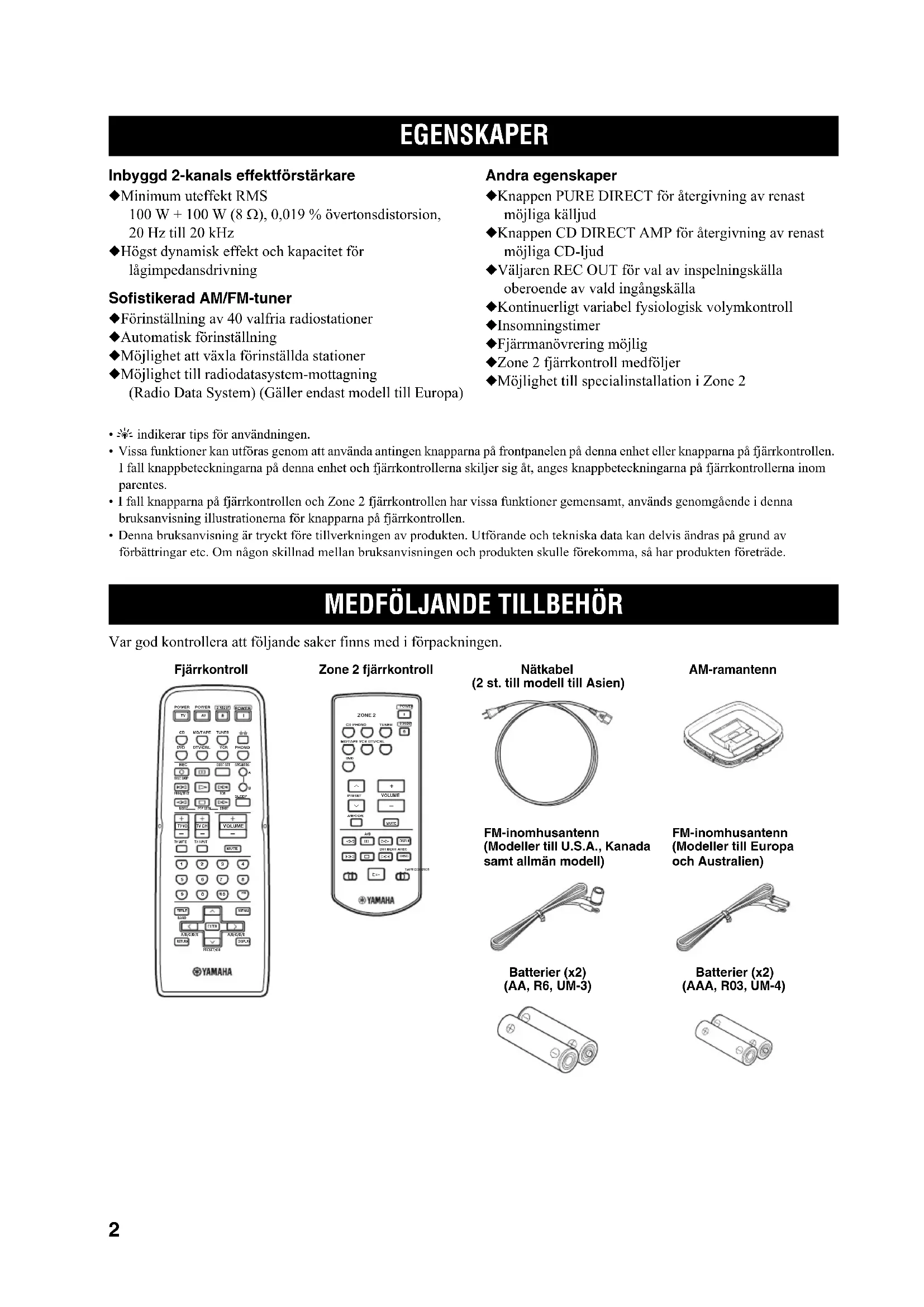 Inbyggd 2-kanals effektförstärkare ◆ Minimum uteffekt RMS 100 W + 100 W (8 Ω), 0,019 % övertonsdistorsion, 20 Hz till 20 kHz ◆ Högst dynamisk effekt och kapacitet för lågimpedansdrivning Sofistikerad AM/FM-tuner ◆ Förinställning av 40 valfria radiostationer ◆ Automatisk förinställning ◆ Möjlighet att växla förinställda stationer ◆ Möjlighet till radiodatasystem-mottagning (Radio Data System) (Gäller endast modell till Europa) Andra egenskaper ◆ Knappen PURE DIRECT för återgivning av renast möjliga källjud ◆ Knappen CD DIRECT AMP för återgivning av renast möjliga CD-ljud ◆ Väljaren REC OUT för val av inspelningskälla oberoende av vald ingångskälla ◆ Kontinuerligt variabel fysiologisk volymkontroll ◆ Insomningstimer ◆ Fjärrmanövrering möjlig ◆ Zone 2 fjärrkontroll medföljer ◆ Möjlighet till specialinstallation i Zone 2