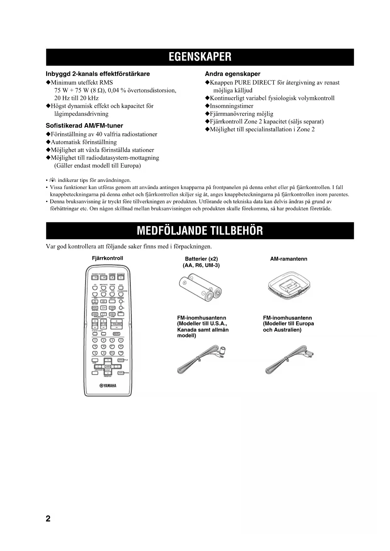 - Änderungen bei technischen Daten bleiben vorbehalten. TECHNISCHE DATEN1 Läs noga denna bruksanvisning för att kunna ha största möjliga nöje av enheten. Förvara bruksanvisningen nära till hands för framtida referens. 2 Installera denna ljudanläggning på ett väl ventilerat, svalt, torrt, rent ställe, och håll den borta från ställen som utsätts för solsken, värmekällor, vibrationer, damm, fukt och/eller kyla. Lämna ett fritt utrymme på minst 30 cm ovanför enheten, minst 20 cm på höger och vänster sida och minst 20 cm på baksidan. 3 Placera enheten på behörigt avstånd från andra elapparater, motorer, transformatorer och annat som kan orsaka störningar. 4 Utsätt inte enheten för hastiga temperaturväxlingar och placera den inte på ett ställe där luftfuktigheten är hög (t.ex. nära en luftfuktare) då fuktbildning i enheten skapar risk för brand, elstötar, skador på enheten eller personskador. 5 Placera inte enheten på ett ställe där främmande föremål kan tränga in i den eller där den kan utsättas för droppar eller vattenstänk. Placera aldrig det följande ovanpå enheten: – Övriga apparater då sådana kan orsaka skador och/eller missfärgning av enhetens hölje. – Brännbara föremål (t.ex. stearinljus) då sådana skapar risk för brand, skador på enheten och/eller personskador. – Vätskebehållare som kan falla och spilla vätska över enheten, vilket skapar risk för elstötar och/eller skador på enheten. 6 Täck aldrig över enheten med en tidning, duk, gardin el.dyl. då detta skapar risk för överhettning. En alltför hög temperatur inuti enheten kan leda till brand, skador på enheten och/eller personskador. 7 Anslut inte enheten till ett vägguttag förrän samtliga övriga anslutningar slutförts. 8 Använd aldrig enheten vänd upp och ned. Detta kan leda till överhettning som orsakar skador. 9 Hantera inte tangenter, reglage och kablar onödigt hårdhänt. 10 Fatta tag i själva kontakten när nätkabeln kopplas bort från vägguttaget; dra aldrig i kabeln. 11 Använd aldrig några kemiska lösningar för rengöring då dessa kan skada ytbehandlingen. Använd en ren, torr trasa. 12 Använd endast den spänning som står angiven på enheten. Anslutning till en strömkälla med högre spänning än den angivna kan orsaka brand, skador på enheten och/eller personskador. YAMAHA åtar sig inget ansvar för skador beroende på att enheten används med en spänning utöver den angivna. 13 Se till att vid åskväder koppla loss nätkabel och utomhusantenner från nätuttaget eller enheten för att förhindra skador till följd av eventuellt åsknedslag. 14 Försöka aldrig att utföra egna reparationer. Kontakta en kvalificerad tekniker från YAMAHA om servicebehov föreligger. Du får inte under några omständigheter ta av höljet. 15 Koppla bort nätkabeln från vägguttaget om enheten inte ska användas under en längre tid (t.ex. under semestern). 16 Placera apparaten nära nätuttaget och så att stickkontakten på nätkabeln lätt kan kommas åt. 17 Läs avsnittet “FELSÖKNING” om vanligt förekommande driftsproblem innan du förutsätter att enheten är söndrig. 18 Innan enheten flyttas, tryck på MASTER ON/OFF så att knappen ställs i OFF-positionen, och koppla loss stickkontakten från vägguttaget. 19 VOLTAGE SELECTOR (Endast modell till Asien och allmän modell) VOLTAGE SELECTOR (spänningsomkopplare) på denna enhets bakpanel måste ställas in på den lokala nätspänningen FÖRE anslutning till nätuttaget. Spänningarna är: Allmän modell ...................... 110/120/220/230–240 V nätspänning, 50/60 Hz Modell till Asien ........ 220/230–240 V nätspänning, 50/60 Hz OBSERVERA: LÄS DETTA INNAN ENHETEN TAS I BRUK. VARNING UTSÄTT INTE ENHETEN FÖR REGN ELLER FUKT DÅ DETTA SKAPAR RISK FÖR BRAND ELLER ELSTÖTAR. Så länge receivern är ansluten till ett nätuttag bryts inte strömtillförseln från nätuttaget, även om receivern slås av med omkopplaren MASTER ON/OFF eller omkopplarna MAIN ZONE ON/OFF och ZONE 2 ON/OFF. I detta tillstånd förbrukar receivern en ytterst liten mängd ström. OBSERVERA Apparaten kopplas inte bort från växelströmskällan (nätet) så länge som den är ansluten till vägguttaget, även om själva apparaten har stängts av. ADVARSEL Netspæendingen til dette apparat er IKKE afbrudt, sålæenge netledningen siddr i en stikkontakt, som er t endt – også selvom der or slukket på apparatets afbryder. VAROITUS Laitteen toisiopiiriin kytketty käyttökytkin ei irroita koko laitetta verkosta.1 PREPARATION INLEDNING GRUNDLÄGGANDE MANÖVRERING YTTERLIGARE INFORMATION AVANCERAD MANÖVRERING Svenska EGENSKAPER ...................................................... 2