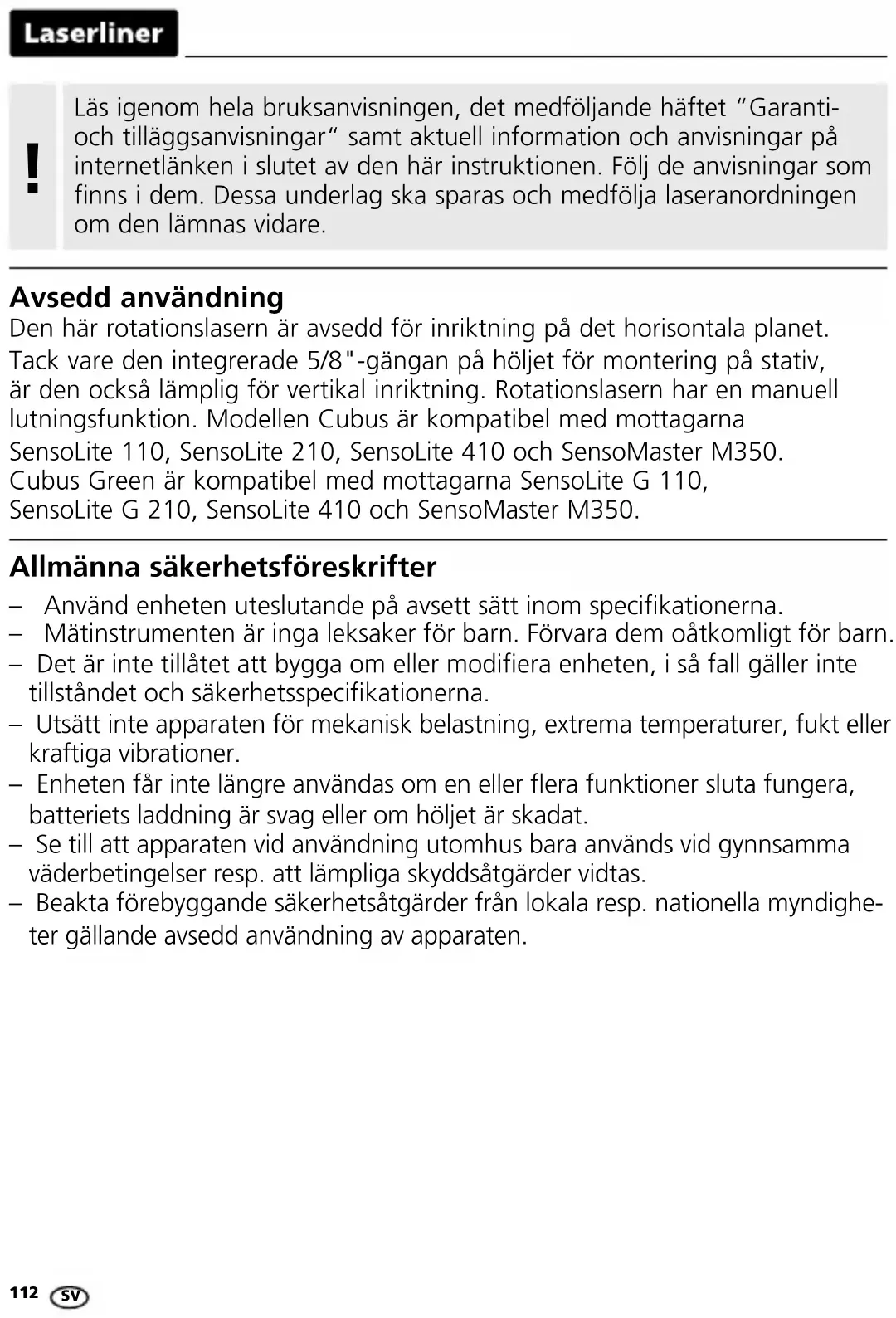 horizontal entre A1 e A2.112 Avsedd användning Den här rotationslasern är avsedd för inriktning på det horisontala planet. Tack vare den integrerade 5/8"-gängan på höljet för montering på stativ, är den också lämplig för vertikal inriktning. Rotationslasern har en manuell lutningsfunktion. Modellen Cubus är kompatibel med mottagarna SensoLite 110, SensoLite 210, SensoLite 410 och SensoMaster M350. Cubus Green är kompatibel med mottagarna SensoLite G 110, SensoLite G 210, SensoLite 410 och SensoMaster M350. Allmänna säkerhetsföreskrifter – Använd enheten uteslutande på avsett sätt inom specikationerna. – Mätinstrumenten är inga leksaker för barn. Förvara dem oåtkomligt för barn. – Det är inte tillåtet att bygga om eller modiera enheten, i så fall gäller inte tillståndet och säkerhetsspecikationerna. – Utsätt inte apparaten för mekanisk belastning, extrema temperaturer, fukt eller kraftiga vibrationer. – Enheten får inte längre användas om en eller era funktioner sluta fungera, batteriets laddning är svag eller om höljet är skadat. – Se till att apparaten vid användning utomhus bara används vid gynnsamma väderbetingelser resp. att lämpliga skyddsåtgärder vidtas. – Beakta förebyggande säkerhetsåtgärder från lokala resp. nationella myndighe- ter gällande avsedd användning av apparaten. Läs igenom hela bruksanvisningen, det medföljande häftet “Garanti- och tilläggsanvisningar“ samt aktuell information och anvisningar på internetlänken i slutet av den här instruktionen. Följ de anvisningar som finns i dem. Dessa underlag ska sparas och medfölja laseranordningen om den lämnas vidare.
