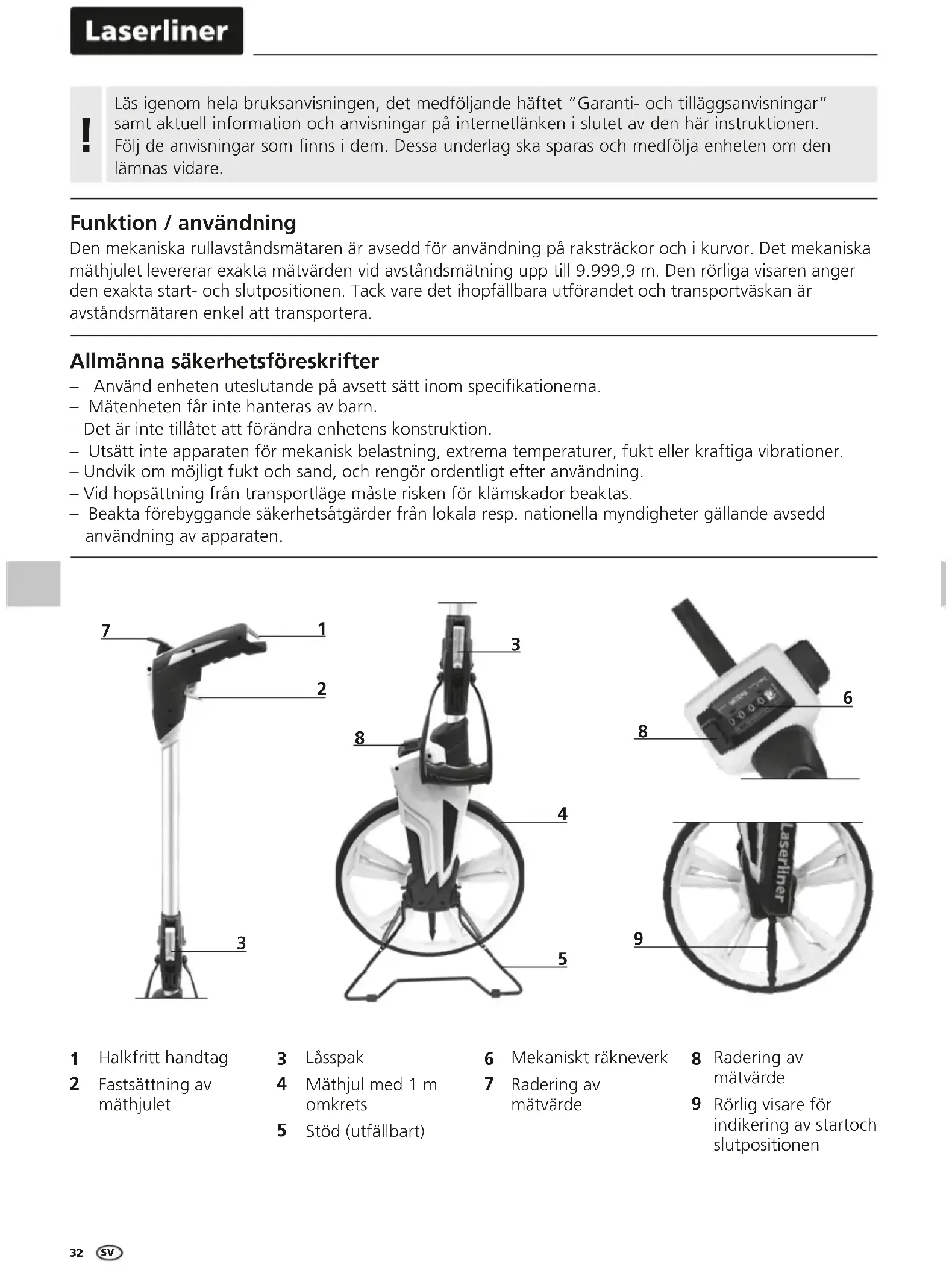 Funktion / användning Den mekaniska rullavståndsmätaren är avsedd för användning på raksträckor och i kurvor. Det mekaniska mäthjulet levererar exakta mätvärden vid avståndsmätning upp till 9.999,9 m. Den rörliga visaren anger den exakta start- och slutpositionen. Tack vare det ihopfällbara utförandet och transportväskan är avståndsmätaren enkel att transportera. Allmänna säkerhetsföreskrifter – Använd enheten uteslutande på avsett sätt inom specikationerna. – Mätenheten får inte hanteras av barn. – Det är inte tillåtet att förändra enhetens konstruktion. – Utsätt inte apparaten för mekanisk belastning, extrema temperaturer, fukt eller kraftiga vibrationer. – Undvik om möjligt fukt och sand, och rengör ordentligt efter användning. – Vid hopsättning från transportläge måste risken för klämskador beaktas. – Beakta förebyggande säkerhetsåtgärder från lokala resp. nationella myndigheter gällande avsedd användning av apparaten.