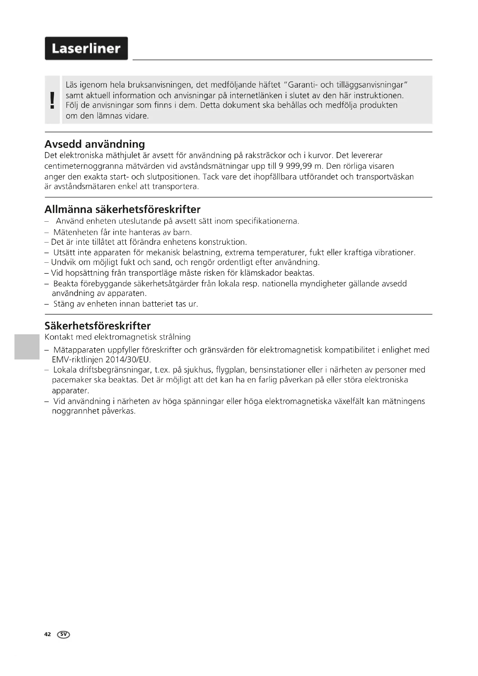 Tekniska data (Tekniska ändringar förbehålls. 23W13) Noggrannhet ± 0,1% Räckvidd 0 – 9.999,99 m Mäthjulets radie 159 mm Mäthjulets omkrets 1000 mm Funktioner Längdmätning, Addition och subtraktion av längder Enheter ft, m Minne 5 minnesplatser Automatisk avstängning efter 5 minuter (vid oförändrad skärmvisning) Strömförsörjning 1 x 9V 6LR61 (9V block) Arbetstemperatur 0 … 40 °C Förvaringstemperatur -20 °C … 70 °C Mått (B x H x Dj) 318 x 1000 x 140 mm Vikt (inklusive batterier) 2100 g EU och EK-bestämmelser och kassering Enheten uppfyller alla nödvändiga normer för fri handel av varor inom EU och UK. Denna produkt, inklusive tillbehör och förpackning, är en elektronisk enhet, som enligt de europeiska och brittiska direktiven för gammal elektrisk och elektronisk utrustning, måste återvinnas på ett miljövänligt sätt för att ta tillvara på värdefulla råvaror. Ytterligare säkerhets- och extra anvisningar på: https://www.laserliner.com Ihopfällning inför transport Anvisningar för underhåll och skötsel Rengör alla komponenter med en lätt fuktad trasa och undvik användning av puts-, skur- och lösningsmedel. Ta ur batterierna före längre förvaring. Förvara apparaten på en ren och torr plats. Kalibrering Mätinstrumentet måste kalibreras och kontrolleras regelbundet för att säkerställa noggrannheten i mätresultaten. Vi rekommenderar ett kalibreringsintervall på ett år. Kontakta er återförsäljare eller vänd er till serviceavdelningen på UMAREX-LASERLINER.46