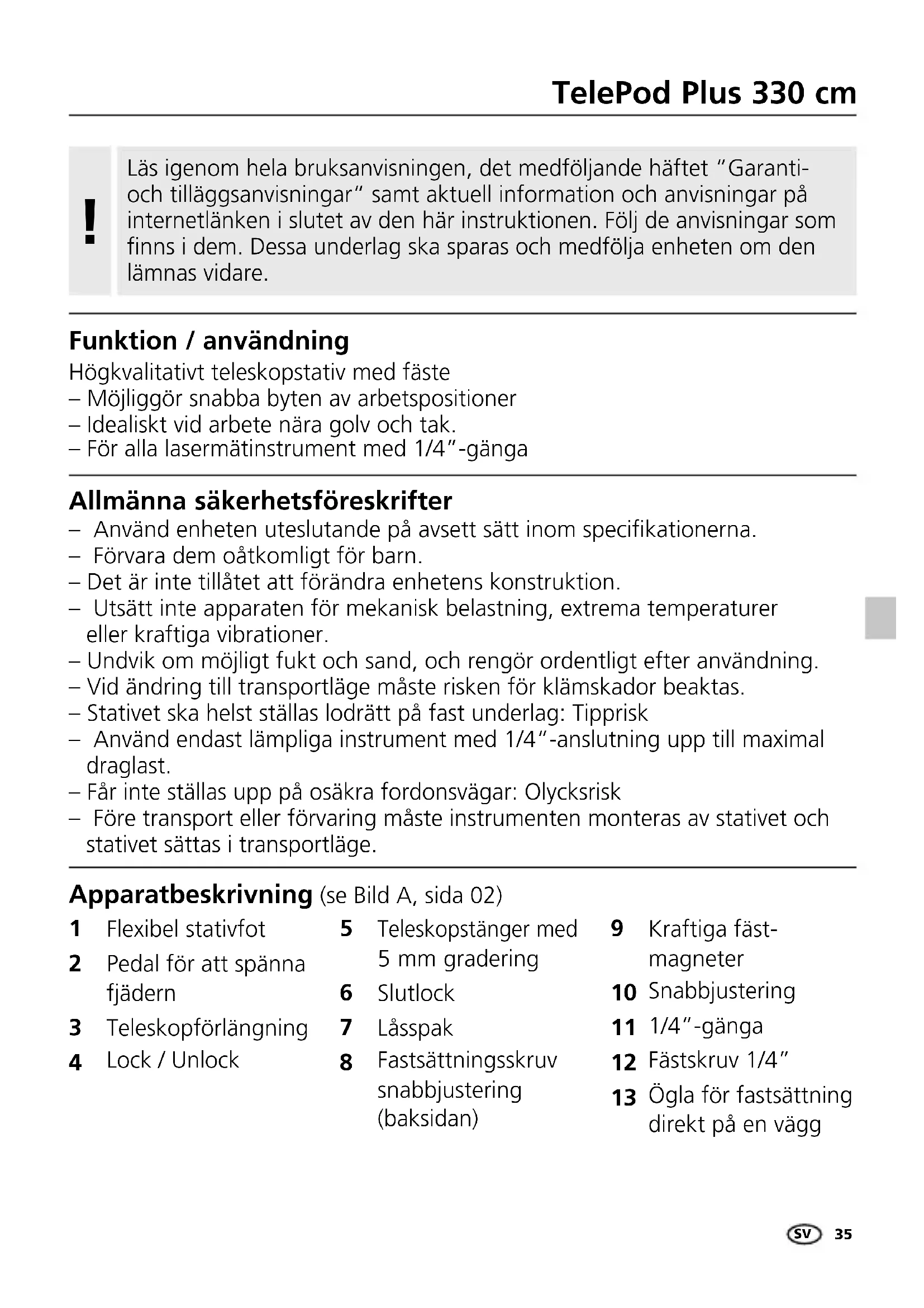 Funktion / användning Högkvalitativt teleskopstativ med fäste – Möjliggör snabba byten av arbetspositioner – Idealiskt vid arbete nära golv och tak. – För alla lasermätinstrument med 1/4”-gänga Läs igenom hela bruksanvisningen, det medföljande häftet “Garanti- och tilläggsanvisningar“ samt aktuell information och anvisningar på internetlänken i slutet av den här instruktionen. Följ de anvisningar som finns i dem. Dessa underlag ska sparas och medfölja enheten om den lämnas vidare.