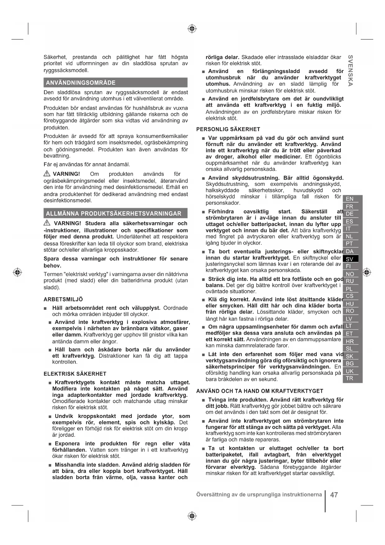 RYGGSSÄCKSMODELL ■ Läs igenom instruktionerna noga. Bekanta dig med reglagen och rätt användning av produkten. ■ Se till att barn eller personer med nedsatt fysisk eller psykisk förmåga, eller personer som inte är erfarna eller inte bekanta med dessa instruktioner aldrig använder produkten. ■ Produkten ska endast användas med växtskyddsmedel som är godkänt av lokala/nationella tillsynsmyndigheter för växtskyddsmedel för användning med ryggburna färgpistoler. ■ Följ tillverkarens anvisningar för kemikalier med hänsyn till skyddsutrustning. ■ För att minska risken för olyckor och produktskador, använd aldrig med: ● antändliga vätskor ● viskösa eller klibbiga vätskor ● frätande eller korrosiva kemikalier ● vätskor varmare än 50 °C ■ Spraya inte om det finns gnistor, flammor eller andra tändningar i närheten. ■ Använd aldrig produkten med defekta skydd eller utan att säkerhetsanordningarna är på plats. Använd aldrig en inkomplett eller modifierad produkt. Användningen av en defekt, inkomplett eller modifierad produkt resultera i en farlig situation. ■ Spraya inte mot personer eller djur. Spraya inte om det är blåsigt. Spraymaterial kan av misstag blåsa på plantor och växter som inte ska sprayas. Spraya inte mot vinden. ■ Stäng omedelbart av produkten och plocka ur batteripaketet vid olycksfall eller fel. Använd inte produkten igen innan den har kontrollerats i sin helhet av en auktoriserad serviceverkstad. ■ Om ingen sprej kommer ut från munstycket eller sprejmängden är minskad, kan slangen eller armsystemet vara blockerat. Skölj och rengör att delar av slangen och armsystemet (sprutpistol, tankfilter, sprejarm, slang) med rent vatten. Blås aldrig in i munstycken eller andra komponenter med munnen. ■ Undvik kontakt med växtskyddsmedel. Byt omedelbart kläder som blivit kontaminerade med växtskyddsmedel. Håll spraymaterial borta från ögon. Om spraymaterial kommer i kontakt med ögonen ska du omedelbart skölja med rent vatten. Om irritation kvarstår ska du omedelbart söka läkarvård. ■ Spraymaterial kan vara hälsofarliga vid inandning, inmundigande eller vid kontakt med hud eller ögon. Bär lämplig skyddande klädsel och utrustning när du: ● fyller på sprejtanken med sprejmaterial ● sprejar ● gör justeringar ● dränerar eller rengör sprejtanken ● byter sprejmaterial ● servar produktenSVENSKA