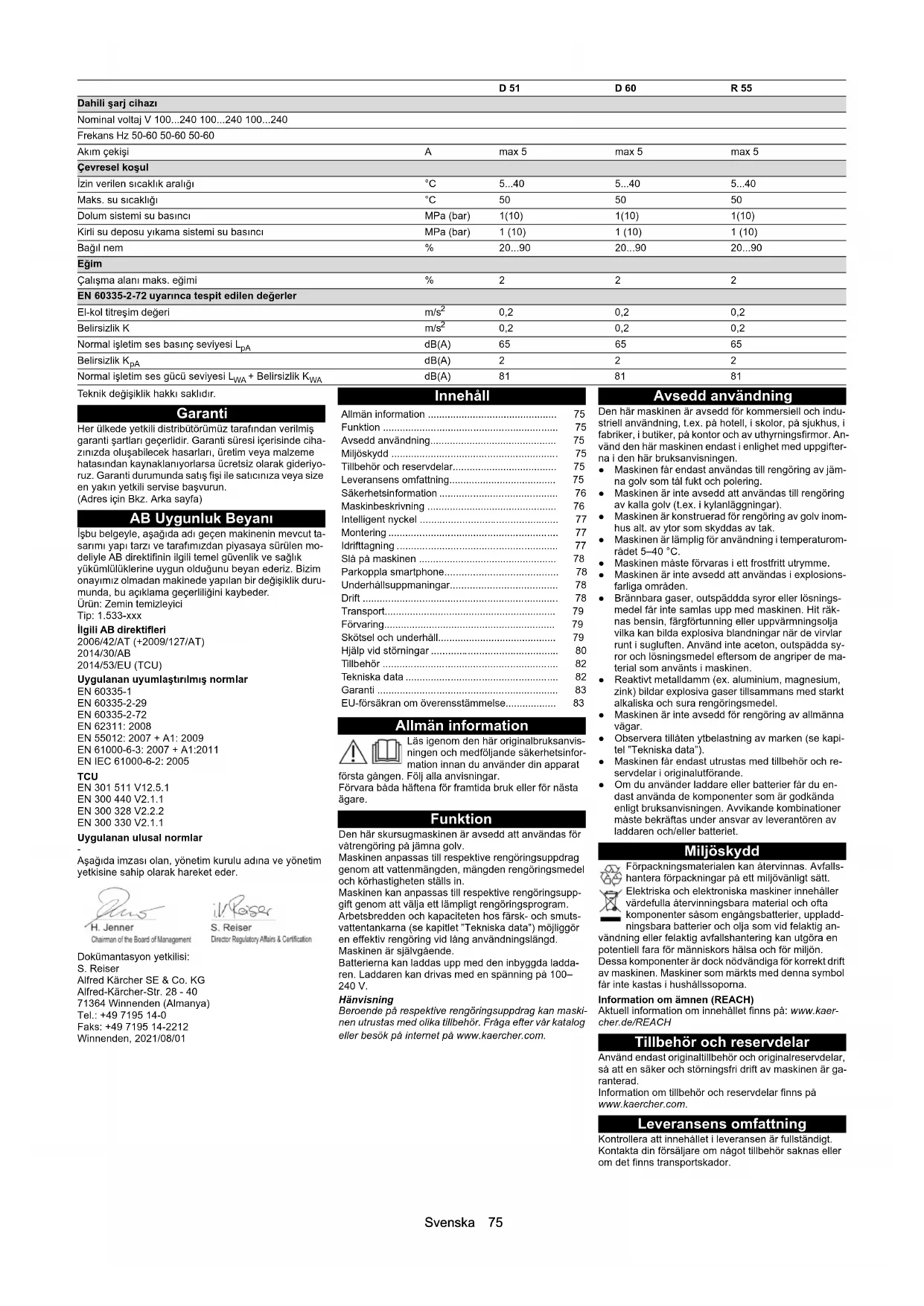 - Undertecknande agerar på uppdrag av och med styrel- sens godkännande. Dokumentationsbefullmäktigad: S. Reiser Alfred Kärcher SE & Co. KG Alfred-Kärcher-Str. 28 - 40 D-71364 Winnenden (Germany) Tfn: +49 7195 14-0 Fax: +49 7195 14-2212 Winnenden, 01.08.2021 Effektdata maskin Märkspänning V 24 24 24 Märkspänning, litiumjon V 25,6 25,6 25,6 Batterikapacitet Ah (5 h) 76 / 80 / 105 / 115 76 / 80 / 105 / 115 76 / 80 / 105 / 115 Batterikapacitet, litiumjon Ah (5 h) 80 80 80 Genomsnittlig effektförbrukning W 1300 1300 1350 Effekt körmotor W 130 130 130 Effekt sugturbin W 250 250 250 Effekt borstdrift W 800 800 980 Kapslingsklass IPX3 IPX3 IPX3 Uppsugning Sugeffekt, luftmängd l/s 21 21 21 Undertryck (max.) kPa (mbar) 9,5 (95) 9,5 (95) 9,5 (95) Rengöringsborstar Borstdiameter mm 510 600 96 Borstlängd mm - - 550 Borstvarvtal 1/min 140 150 965 Intern laddare Märkspänning V 100 p. 240