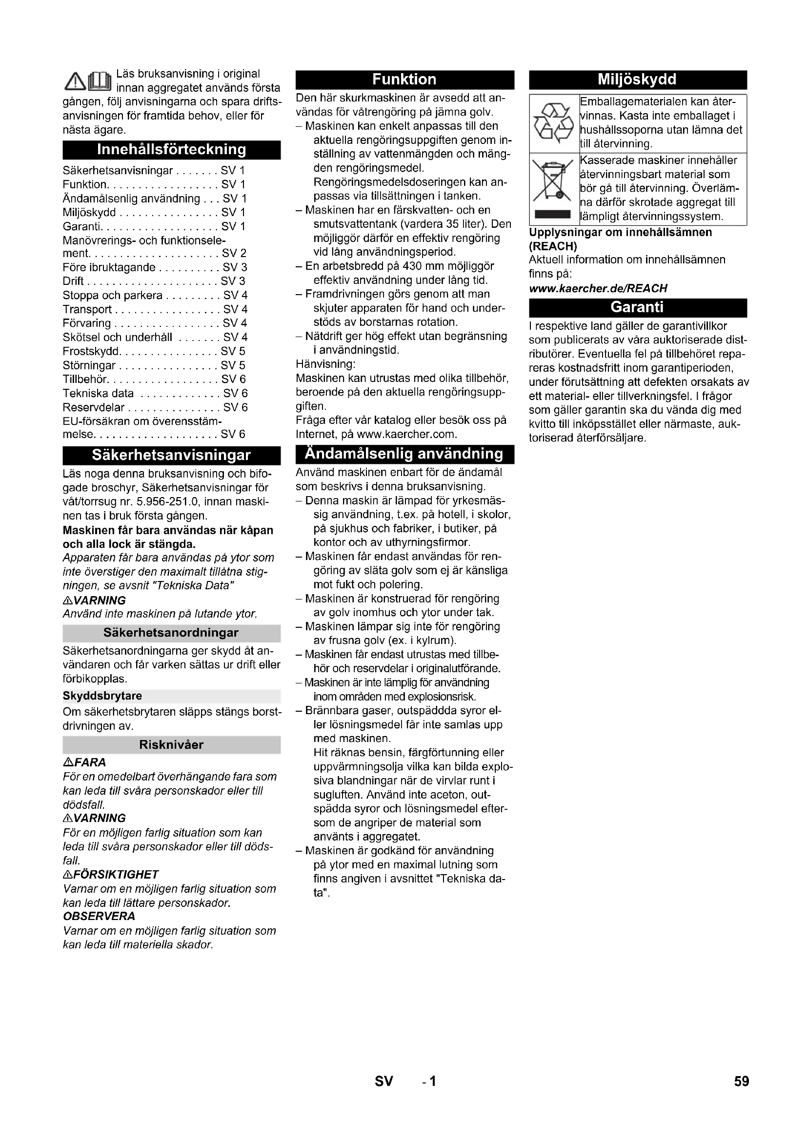 Chairman of the Board of Management Director Regulatory Affairs & Certification 58 NO- 1 Läs bruksanvisning i original innan aggregatet används första gången, följ anvisningarna och spara drifts- anvisningen för framtida behov, eller för nästa ägare. Läs noga denna bruksanvisning och bifo- gade broschyr, Säkerhetsanvisningar för våt/torrsug nr. 5.956-251.0, innan maski- nen tas i bruk första gången. Maskinen får bara användas när kåpan och alla lock är stängda. Apparaten får bara användas på ytor som inte överstiger den maximalt tillåtna stig- ningen, se avsnit "Tekniska Data" 몇 VARNING Använd inte maskinen på lutande ytor. Säkerhetsanordningarna ger skydd åt an- vändaren och får varken sättas ur drift eller förbikopplas. Om säkerhetsbrytaren släpps stängs borst- drivningen av. FARA För en omedelbart överhängande fara som kan leda till svåra personskador eller till dödsfall. 몇 VARNING För en möjligen farlig situation som kan leda till svåra personskador eller till döds- fall. 몇 FÖRSIKTIGHET Varnar om en möjligen farlig situation som kan leda till lättare personskador. OBSERVERA Varnar om en möjligen farlig situation som kan leda till materiella skador. Den här skurkmaskinen är avsedd att an- vändas för våtrengöring på jämna golv. – Maskinen kan enkelt anpassas till den aktuella rengöringsuppgiften genom in- ställning av vattenmängden och mäng- den rengöringsmedel. Rengöringsmedelsdoseringen kan an- passas via tillsättningen i tanken. – Maskinen har en färskvatten- och en smutsvattentank (vardera 35 liter). Den möjliggör därför en effektiv rengöring vid lång användningsperiod. – En arbetsbredd på 430 mm möjliggör effektiv användning under lång tid. – Framdrivningen görs genom att man skjuter apparaten för hand och under- stöds av borstarnas rotation. – Nätdrift ger hög effekt utan begränsning i användningstid. Hänvisning: Maskinen kan utrustas med olika tillbehör, beroende på den aktuella rengöringsupp- giften. Fråga efter vår katalog eller besök oss på Internet, på www.kaercher.com. Använd maskinen enbart för de ändamål som beskrivs i denna bruksanvisning. – Denna maskin är lämpad för yrkesmäs- sig användning, t.ex. på hotell, i skolor, på sjukhus och fabriker, i butiker, på kontor och av uthyrningsfirmor. – Maskinen får endast användas för ren- göring av släta golv som ej är känsliga mot fukt och polering. – Maskinen är konstruerad för rengöring av golv inomhus och ytor under tak. – Maskinen lämpar sig inte för rengöring av frusna golv (ex. i kylrum). – Maskinen får endast utrustas med tillbe- hör och reservdelar i originalutförande. – Maskinen är inte lämplig för användning inom områden med explosionsrisk. – Brännbara gaser, outspäddda syror el- ler lösningsmedel får inte samlas upp med maskinen. Hit räknas bensin, färgförtunning eller uppvärmningsolja vilka kan bilda explo- siva blandningar när de virvlar runt i sugluften. Använd inte aceton, out- spädda syror och lösningsmedel efter- som de angriper de material som använts i aggregatet. – Maskinen är godkänd för användning på ytor med en maximal lutning som finns angiven i avsnittet "Tekniska da- ta". Upplysningar om innehållsämnen (REACH) Aktuell information om innehållsämnen finns på: www.kaercher.de/REACH I respektive land gäller de garantivillkor som publicerats av våra auktoriserade dist- ributörer. Eventuella fel på tillbehöret repa- reras kostnadsfritt inom garantiperioden, under förutsättning att defekten orsakats av ett material- eller tillverkningsfel. I frågor som gäller garantin ska du vända dig med kvitto till inköpsstället eller närmaste, auk- toriserad återförsäljare. Innehållsförteckning Säkerhetsanvisningar . . . . . . . SV 1 Funktion. . . . . . . . . . . . . . . . . . SV 1 Ändamålsenlig användning . . . SV 1 Miljöskydd . . . . . . . . . . . . . . . . SV 1 Garanti. . . . . . . . . . . . . . . . . . . SV 1 Manövrerings- och funktionsele- ment. . . . . . . . . . . . . . . . . . . . . SV 2 Före ibruktagande . . . . . . . . . . SV 3 Drift . . . . . . . . . . . . . . . . . . . . . SV 3 Stoppa och parkera . . . . . . . . . SV 4 Transport . . . . . . . . . . . . . . . . . SV 4 Förvaring . . . . . . . . . . . . . . . . . SV 4 Skötsel och underhåll . . . . . . . SV 4 Frostskydd. . . . . . . . . . . . . . . . SV 5 Störningar . . . . . . . . . . . . . . . . SV 5 Tillbehör. . . . . . . . . . . . . . . . . . SV 6 Tekniska data . . . . . . . . . . . . . SV 6 Reservdelar . . . . . . . . . . . . . . . SV 6 EU-försäkran om överensstäm- melse. . . . . . . . . . . . . . . . . . . . SV 6 Säkerhetsanvisningar Säkerhetsanordningar Skyddsbrytare Risknivåer Funktion Ändamålsenlig användning Miljöskydd Emballagematerialen kan åter- vinnas. Kasta inte emballaget i hushållssoporna utan lämna det till återvinning. Kasserade maskiner innehåller återvinningsbart material som bör gå till återvinning. Överläm- na därför skrotade aggregat till lämpligt återvinningssystem. Garanti 59SV- 2 1 Luddsil 2 Skyddsbrytare 3 Avloppsslang för smutsvatten med do- seranordning 4 Fästskena för Homebase 5 Flottör 6 Färskvattentank 7 Förslutning färskvattentank 8 Greppfördjupning 9 Rengöringshuvud 10 Skivborste 11 Påfyllningsöppning färskvattentank 12 Bygel borstbyte 13 Smutsvattentank 14 Display för visning av påfyllningsnivå av färskvatten 15 Vridhandtag för lutning av sugskenan 16 Höjdinställning sugbalkar * 17 Vingmutter för fastsättning av sug- skenan 18 Sugskenor * 19 Sugslang 20 Justeringsknapp vattenmängd 21 Nätkabel med nätkontakt 22 Spak sugskenenedsänkning 23 Manöverpult 24 Skjuthandtag 25 Förvaringsyta för rengöringsset "Home- base Box" 26 Skydd smutsvattentank