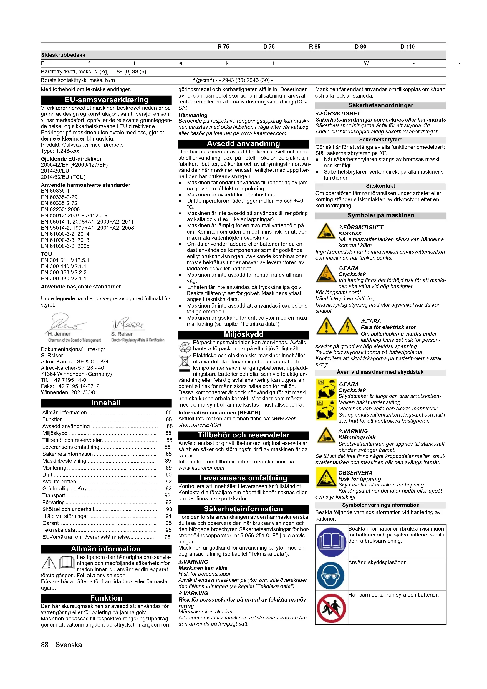 Undertegnede handler på vegne av og med fullmakt fra styret. Dokumentasjonsfullmektig: S. Reiser Alfred Kärcher SE & Co. KG Alfred-Kärcher-Str. 28 - 40 71364 Winnenden (Germany) Tlf.: +49 7195 14-0 Faks: +49 7195 14-2212 Winnenden, 2021/03/01 Innehåll Allmän information Läs igenom den här originalbruksanvis- ningen och medföljande säkerhetsinfor- mation innan du använder din apparat första gången. Följ alla anvisningar. Förvara båda häftena för framtida bruk eller för nästa ägare. Funktion Den här skursugmaskinen är avsedd att användas för våtrengöring eller för polering på jämna golv. Maskinen anpassas till respektive rengöringsuppdrag genom att vattenmängden, borsttrycket, mängden ren- göringsmedel och körhastigheten ställs in. Doseringen av rengöringsmedlet sker genom tillsättning i färskvat- tentanken eller en alternativ doseringsanordning (DO- SA). Hänvisning Beroende på respektive rengöringsuppdrag kan maski- nen utrustas med olika tillbehör. Fråga efter vår katalog eller besök på internet på www.kaercher.com. Avsedd användning Den här maskinen är avsedd för kommersiell och indu- striell användning, t.ex. på hotell, i skolor, på sjukhus, i fabriker, i butiker, på kontor och av uthyrningsfirmor. An- vänd den här maskinen endast i enlighet med uppgifter- na i den här bruksanvisningen. ● Maskinen får endast användas till rengöring av jäm- na golv som tål fukt och polering. ● Maskinen är avsedd för inomhusbruk. ● Drifttemperaturområdet ligger mellan +5 och +40 °C. ● Maskinen är inte avsedd att användas till rengöring av kalla golv (t.ex. i kylanläggningar). ● Maskinen är lämplig för en maximal vattenhöjd på 1 cm. Kör inte i områden om det finns risk för att den maximala vattenhöjden överskrids. ● Om du använder laddare eller batterier får du en- dast använda de komponenter som är godkända enligt bruksanvisningen. Avvikande kombinationer måste bekräftas under ansvar av leverantören av laddaren och/eller batteriet. ● Maskinen är inte avsedd för rengöring av allmän väg. ● Enheten får inte användas på tryckkänsliga golv. Beakta tillåten ytlast för golvet. Maskinens ytlast anges i tekniska data. ● Maskinen är inte avsedd att användas i explosions- farliga områden. ● Maskinen är godkänd för drift på ytor med en maxi- mal lutning (se kapitel ”Tekniska data”). Miljöskydd Förpackningsmaterialen kan återvinnas. Avfalls- hantera förpackningar på ett miljövänligt sätt. Elektriska och elektroniska maskiner innehåller ofta värdefulla återvinningsbara material och komponenter såsom engångsbatterier, uppladd- ningsbara batterier och olja, som vid felaktig an- vändning eller felaktig avfallshantering kan utgöra en potentiell risk för människors hälsa och för miljön. Dessa komponenter är dock nödvändiga för att maski- nen ska kunna arbeta korrekt. Maskiner som märkts med denna symbol får inte kastas i hushållssoporna. Information om ämnen (REACH) Aktuell information om ämnen finns på: www.kaer- cher.com/REACH Tillbehör och reservdelar Använd endast originaltillbehör och originalreservdelar, så att en säker och störningsfri drift av maskinen är ga- ranterad. Information om tillbehör och reservdelar finns på www.kaercher.com. Leveransens omfattning Kontrollera att innehållet i leveransen är fullständigt. Kontakta din försäljare om något tillbehör saknas eller om det finns transportskador. Säkerhetsinformation Före den första användningen av den här maskinen ska du läsa och observera den här bruksanvisningen och den bifogade broschyren Säkerhetsanvisningar för bor- strengöringsapparater, nr 5.956-251.0. Följ alla anvis- ningar. Maskinen är godkänd för användning på ytor med en begränsad lutning (se kapitel ”Tekniska data”). 몇 VARNING Maskinen kan välta Risk för personskador Använd endast maskinen på ytor som inte överskrider den tillåtna lutningen (se kapitel "Tekniska data"). 몇 VARNING Risk för personskador på grund av felaktig manöv- rering Människor kan skadas. Alla som använder maskinen måste instrueras om hur den används på lämpligt sätt. Maskinen får endast användas om tillkopplas om kåpan och alla lock är stängda. Säkerhetsanordningar 몇 FÖRSIKTIGHET Säkerhetsanordningar som saknas eller har ändrats Säkerhetsanordningarna är till för att skydda dig. Ändra eller förbikoppla aldrig säkerhetsanordningar. Säkerhetsbrytare Gör så här för att stänga av alla funktioner omedelbart: Ställ säkerhetsbrytaren på ”0”. ● När säkerhetsbrytaren stängs av bromsas maski- nen kraftigt. ● Säkerhetsbrytaren verkar direkt på alla maskinens funktioner Sitskontakt Om operatören lämnar förarsitsen under arbetet eller körning stänger sitskontakten av drivmotorn efter en kort fördröjning. Symboler på maskinen 몇FÖRSIKTIGHET Klämrisk När smutsvattentanken sänks kan händerna komma i kläm. Inga kroppsdelar får hamna mellan smutsvattentanken och maskinen när tanken sänks. FARA Olycksrisk Vid lutning finns det förhöjd risk för att maski- nen ska välta vid hög hastighet. Kör långsamt neråt. Vänd inte på en sluttning. Undvik ryckig styrning med stor styrvinkel när du kör snabbt. FARA Fara för elektrisk stöt Om batteripolerna vidrörs under laddning finns det risk för person- skador på grund av hög elektrisk spänning. Ta inte bort skyddskåporna på batteripolerna. Kontrollera att skyddskåporna på batteripolerna sitter riktigt. Även vid maskiner med skyddstak FARA Olycksrisk Skyddstaket är tungt och drar smutsvatten- tanken bakåt under sväng. Maskinen kan välta och skada människor. Sväng smutsvattentanken långsamt och håll i den hårt för att kontrollera hastigheten. 몇VARNING Klämningsrisk Smutsvattentanken ger upphov till stark kraft när den svänger framåt. Se till att det inte finns några kroppsdelar mellan smut- svattentanken