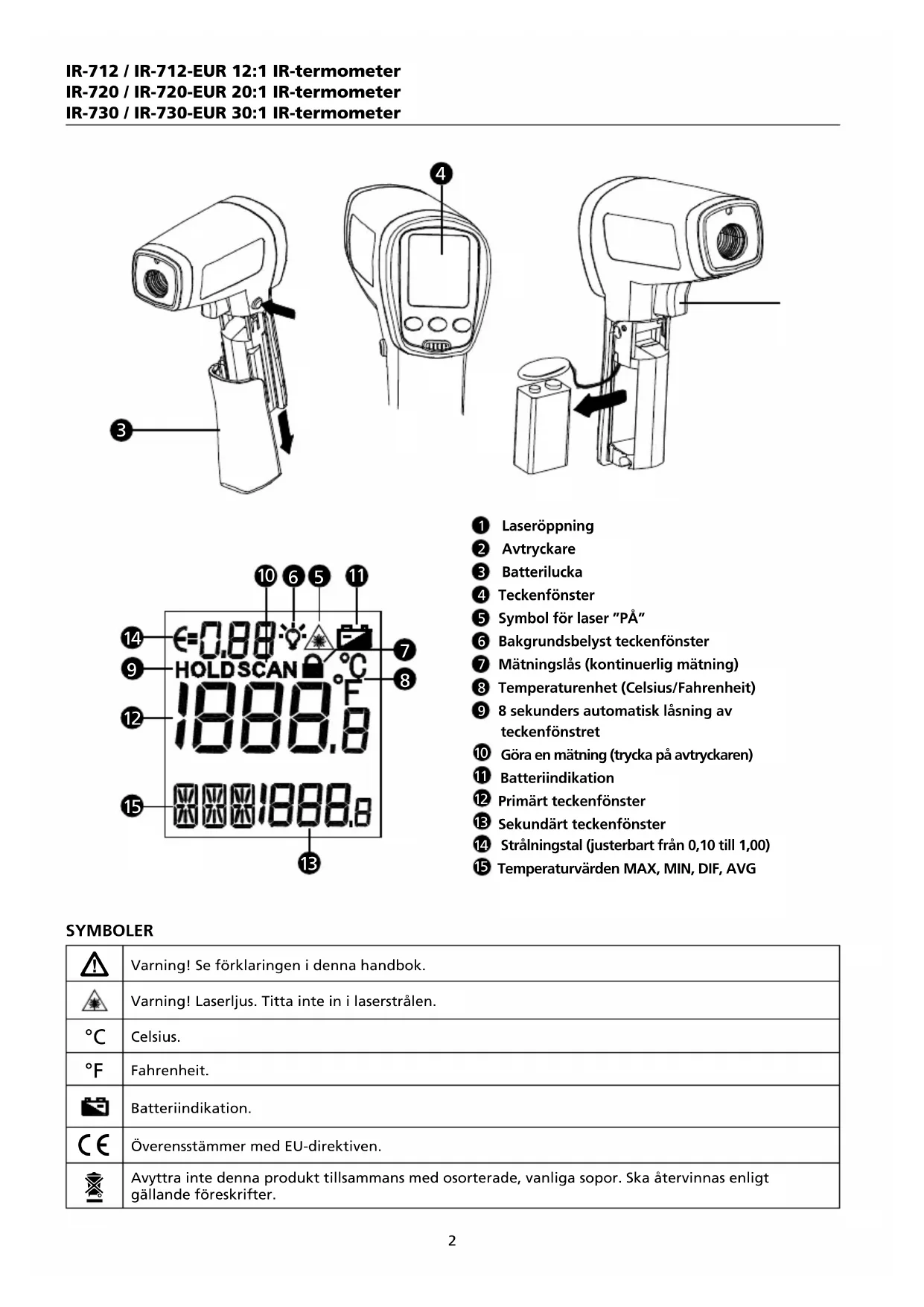 Varning! Se förklaringen i denna handbok.Varning! Laserljus. Titta inte in i laserstrålen. Celsius. Fahrenheit.Batteriindikation. Överensstämmer med EU-direktiven. Avyttra inte denna produkt tillsammans med osorterade, vanliga sopor. Ska återvinnas enligt gällande föreskrifter. IR-712 / IR-712-EUR 12:1 IR-termometer IR-720 / IR-720-EUR 20:1 IR-termometer IR-730 / IR-730-EUR 30:1 IR-termometer