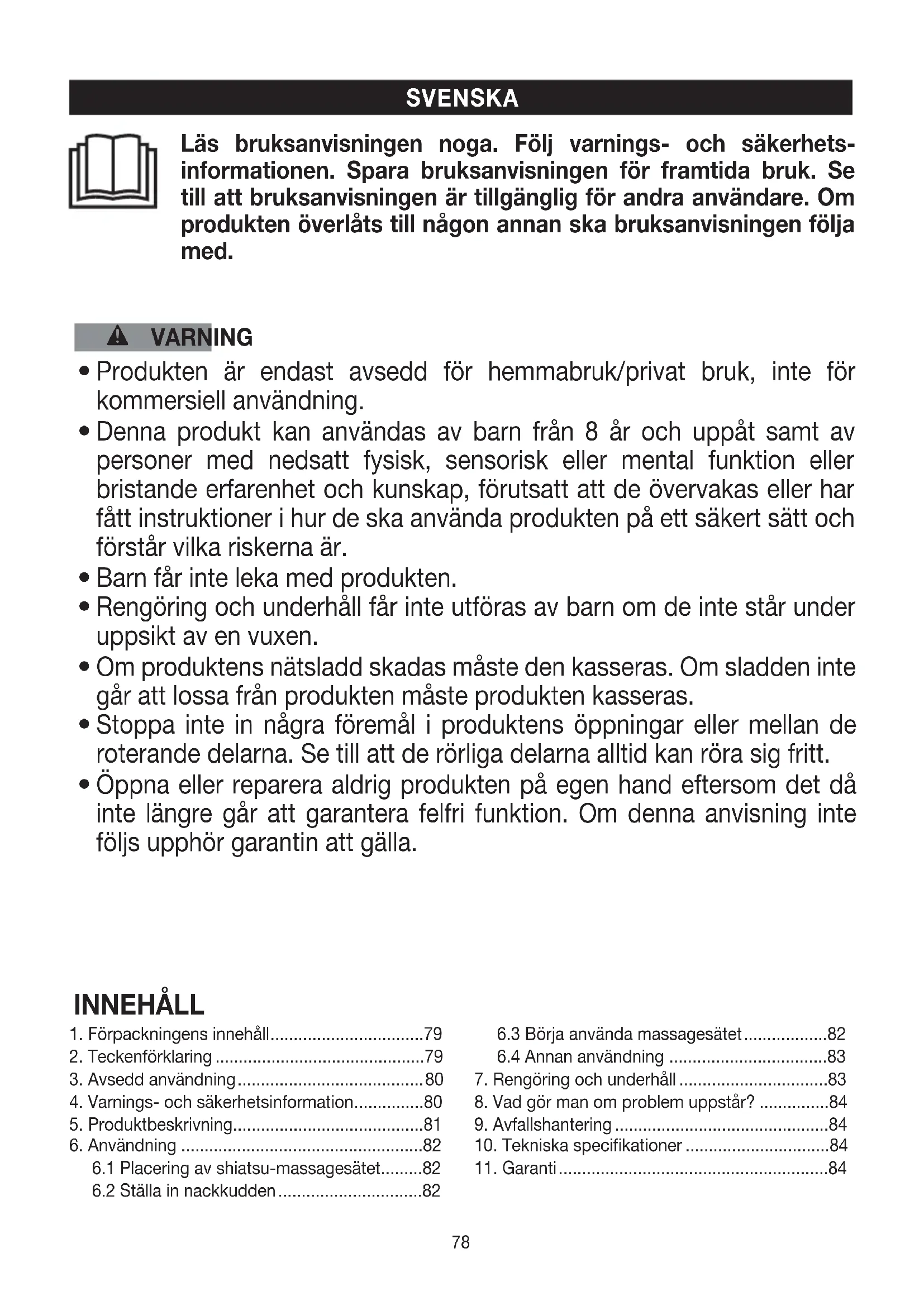 Produkten är uteslutande avsedd för rygg- och nackmassage på människor. Den ersätter inte läkar- behandling. Använd inte massagesätet om en eller flera av följande varningar passar in på dig. VARNING Massagesätet bör inte användas