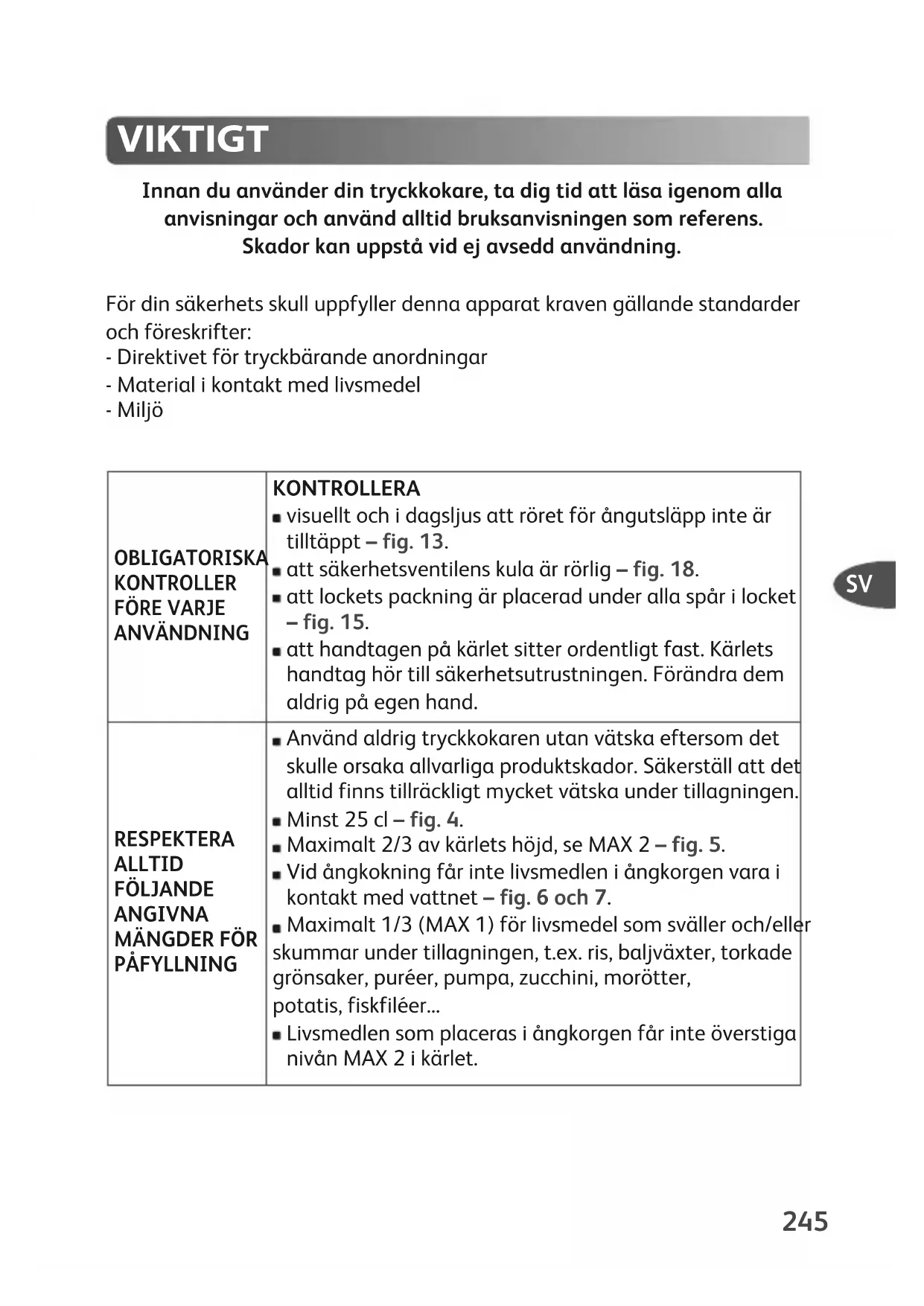 Innan du använder din tryckkokare, ta dig tid att läsa igenom alla anvisningar och använd alltid bruksanvisningen som referens. Skador kan uppstå vid ej avsedd användning. För din säkerhets skull uppfyller denna apparat kraven gällande standarder och föreskrifter: - Direktivet för tryckbärande anordningar - Material i kontakt med livsmedel - Miljö VIKTIGT OBLIGATORISKA KONTROLLER