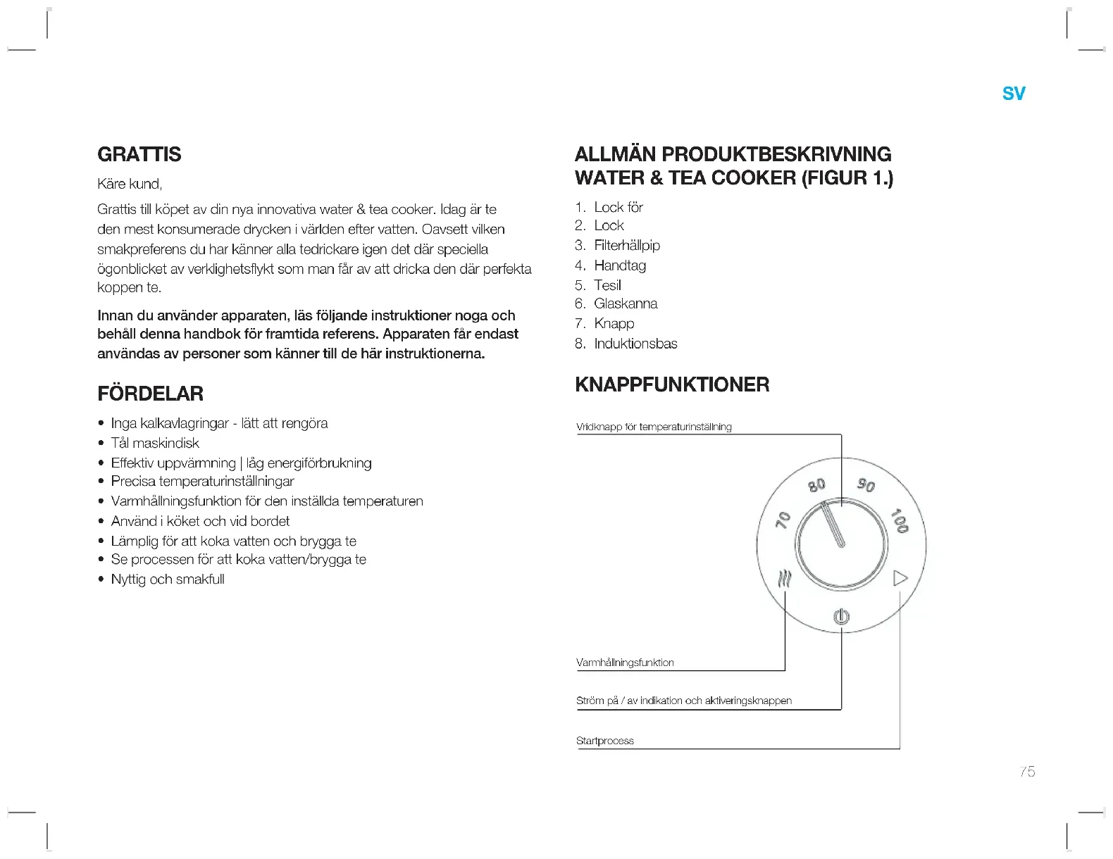 GRATTIS Käre kund, Grattis till köpet av din nya innovativa water & tea cooker. Idag är te den mest konsumerade drycken i världen efter vatten. Oavsett vilken smakpreferens du har känner alla tedrickare igen det där speciella ögonblicket av verklighetsflykt som man får av att dricka den där perfekta koppen te. Innan du använder apparaten, läs följande instruktioner noga och behåll denna handbok för framtida referens. Apparaten får endast användas av personer som känner till de här instruktionerna. FÖRDELAR