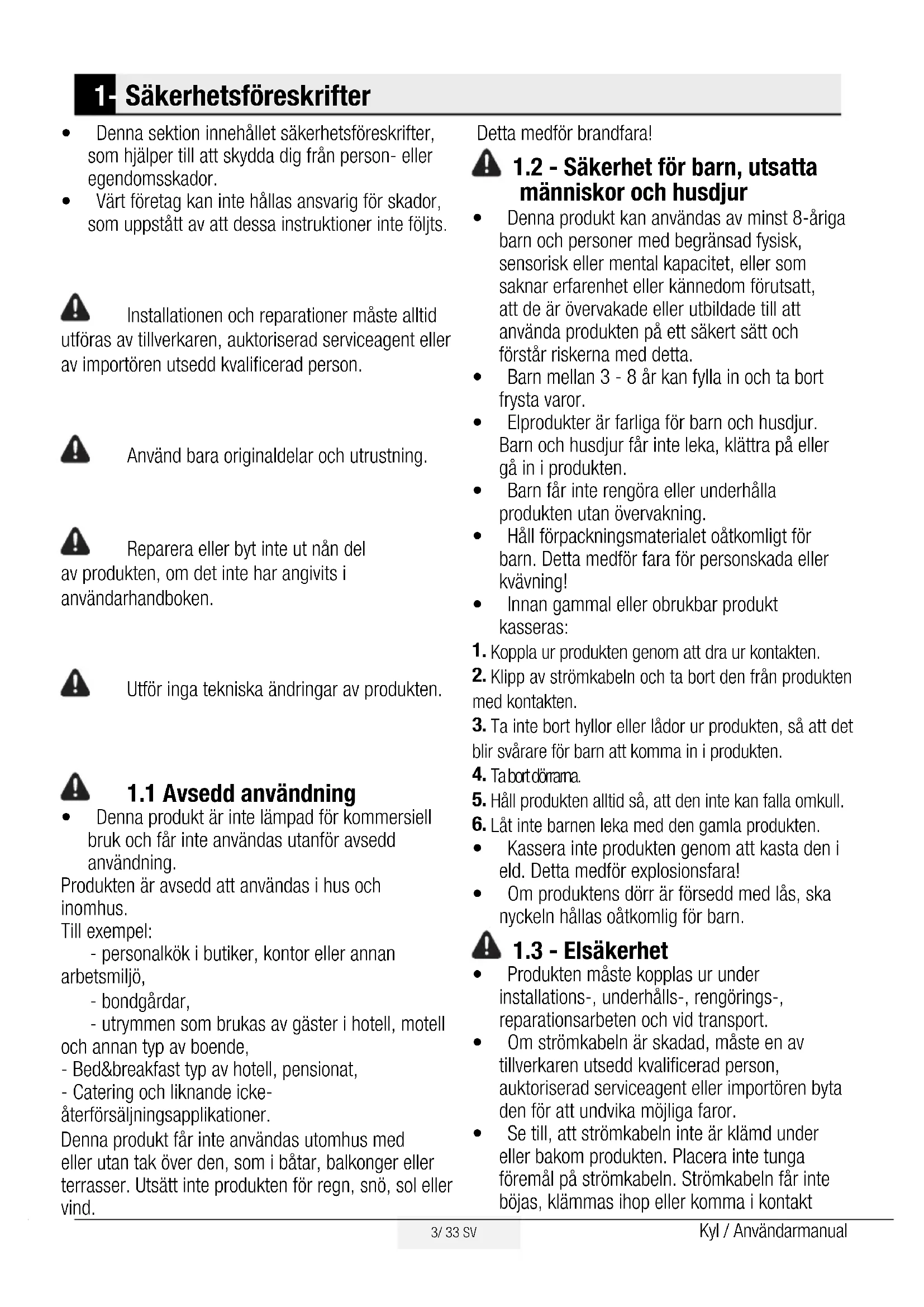1- Säkerhetsföreskrifter4 / 33 SV