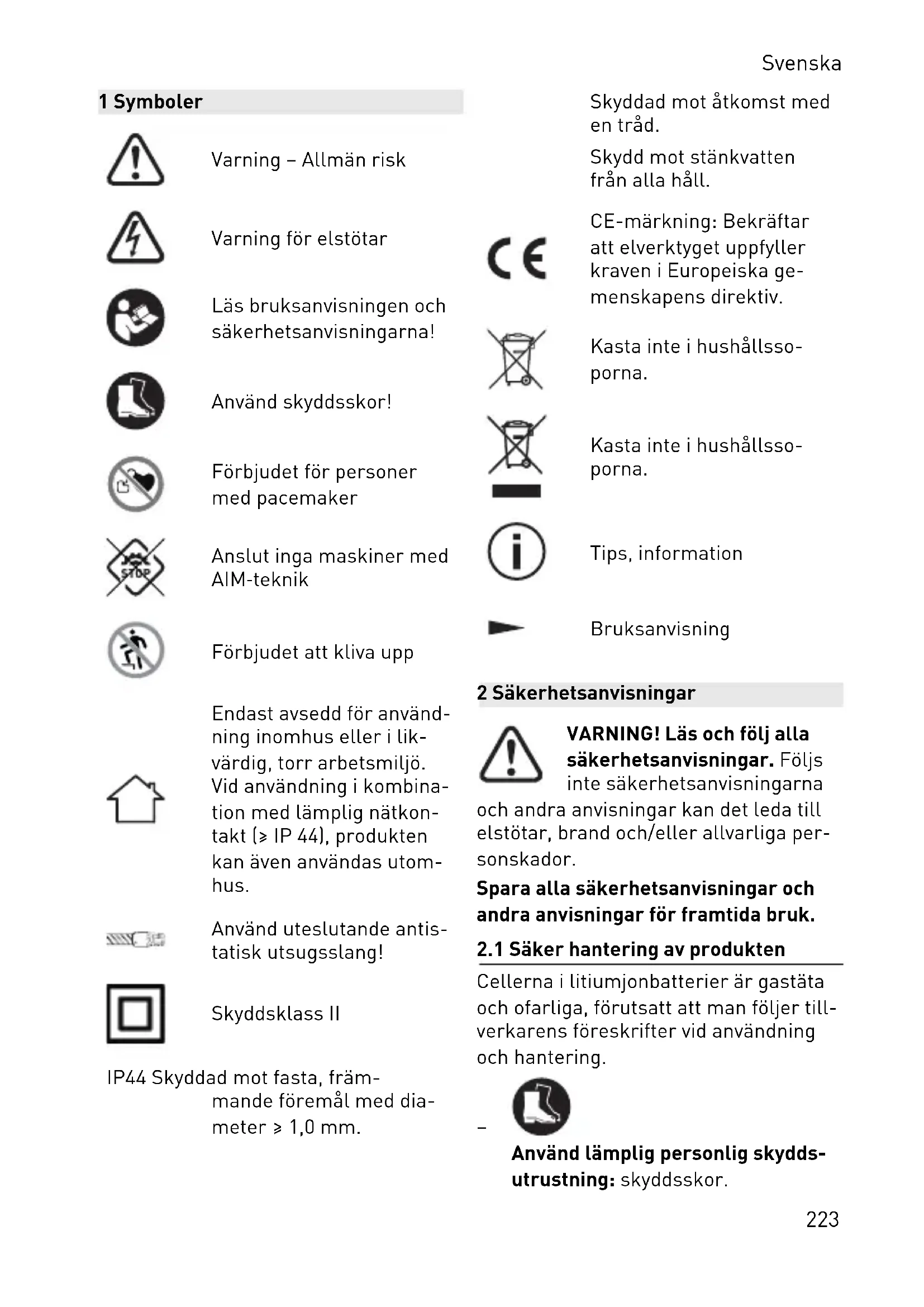 [1-6] får inte kortslutas. – Vidrör inte AC‑laddningsingång en [1-1]. – Vidrör inte anslutningar och elekt riska kontakter med fingrarna, smycken eller andra föremål av me tall. – Får inte användas eller förvaras på ställen där explosionsrisk förelig ger. – Ställ inte upp produkten i stående vatten. – Håll skyddslocket på AC‑utgång en [1-2] stängt medan laddning på går. – Håll Systainerlocket [1-5] stängt under drift och förvaring. – Undvik förvaring vid höga tempera turer (max. 45 °C). Håll produkten borta från externa värmekällor (t.ex. exponering för sol undre längre tid, eld). – Ingen våtrengöring (särskilt inte med högtryckstvätt). – Använd inga kemikalier, bränslen eller smörjmedel (t.ex. för rengör ing). – Denna produkt får inte användas av personer som kan reagera extra känsligt på elstötar (t.ex. personer med pacemaker), eftersom statisk uppladdning av produkten och dess anslutna förbrukare inte kan uteslu tas. – Personer med funktionsnedsätt ning samt barn får inte använda produkten, alternativt får endast använda produkten under uppsikt. – Produkten får inte användas på höjder över 2000 m.ö.h. – Får inte användas som fotsteg eller stege. – Får inte användas som underlag el ler provisorisk arbetsbänk. – Får inte hängas i en kran. – Produkten och batteriet får inte kastas i eld eller heta ugnar och inte heller klämmas eller skäras sönder, eftersom det kan leda till explosion. För korrekt avfallshan tering, se kapitel 11.