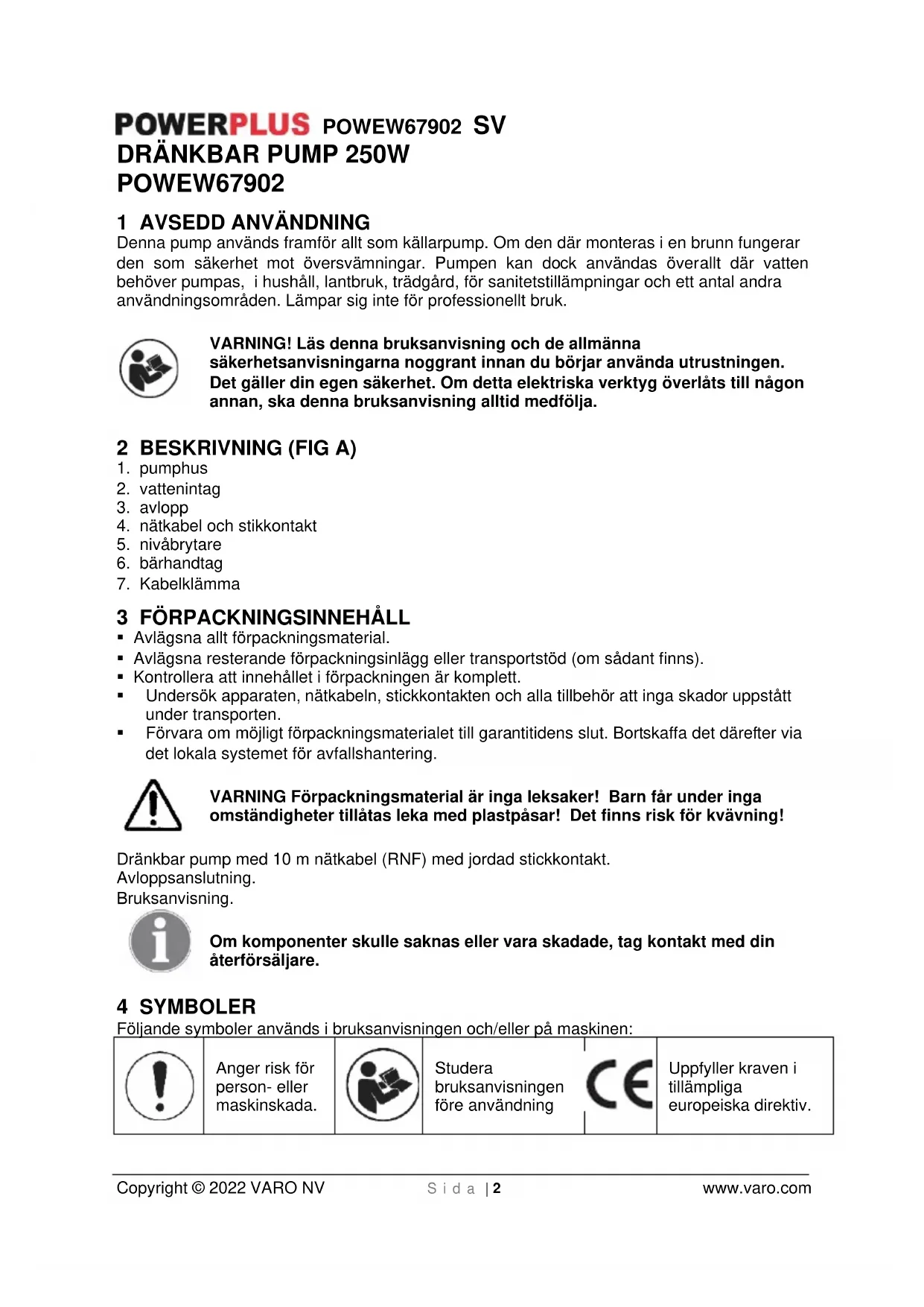 - Se vid inställning av nivåbrytaren till att nivåbrytaren inte rör vid bottnen innan AV- brytpunkten nåtts. OBS! Risk för torrkörning. Denna utrustning får inte användas av barn eller personer som är fysiskt eller mentalt handikappade eller personer som saknar erfarenhet eller kännedom om detta slags apparatur, utom i det fall dessa personer står under vägledning av en person som ansvarar för deras säkerhet, en övervakare, och som studerat dessa anvisningar beträffande utrustningens användning.POWEW67902 SV Copyright © 2022 VARO NV S i d a | 5 www.varo.com