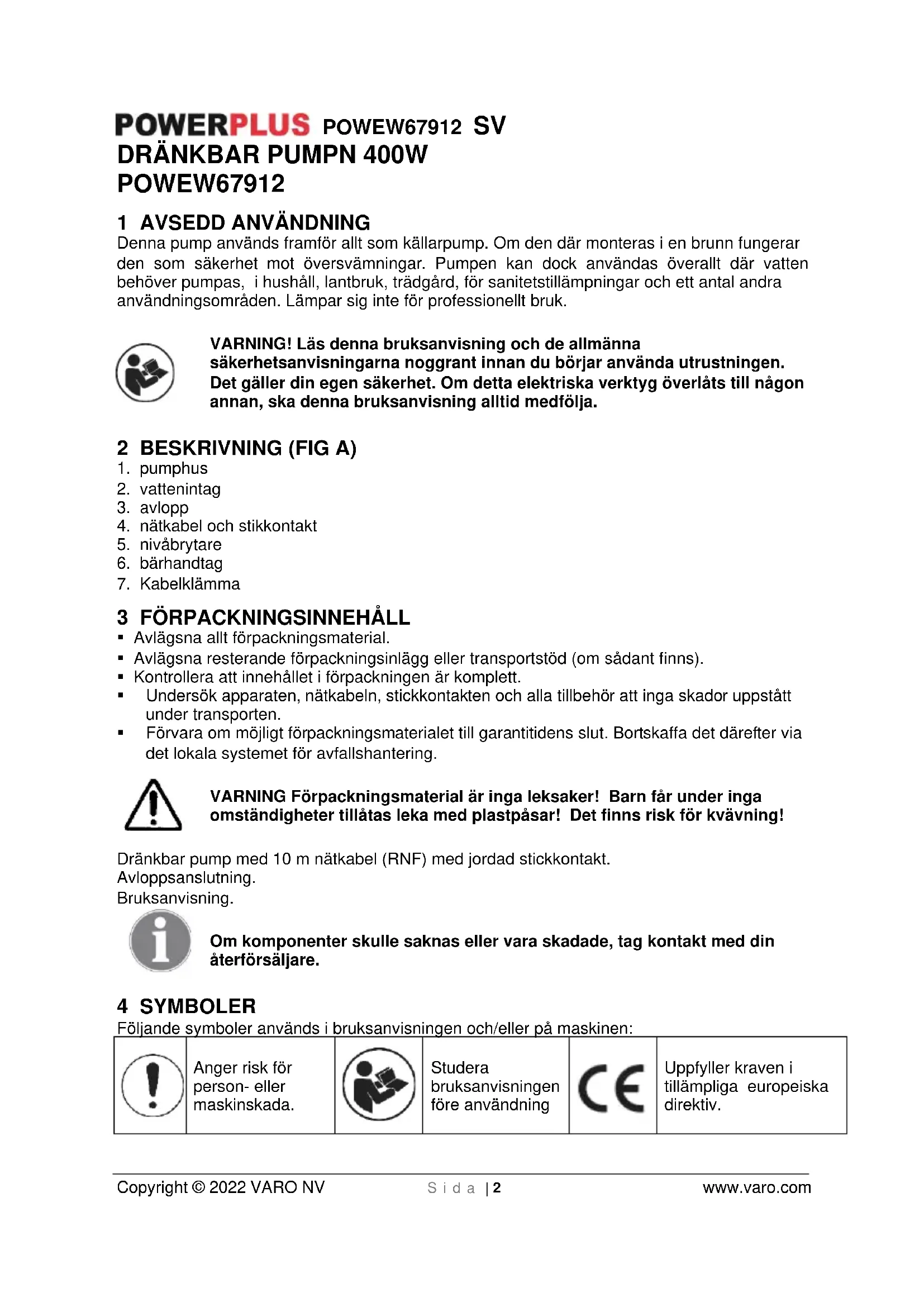 Då produkten tjänat ut får den inte lämnas med det vanliga hushållsavfallet utan ska deponeras på miljömässigt korrekt sätt och enligt gällande lokala bestämmelser. Avfall som kommer från elektriska maskinkomponenter får inte hanteras som vanligt hushållsavfall. De ska deponeras för återvinning där återvinningscentraler finns att tillgå. Kontakta lokala myndigheter eller din återförsäljare för närmare information om återvinning.POWEW67912 SV Copyright © 2022 VARO NV S i d a | 8 www.varo.com 16 KONFORMITETSDEKLARATION VARO – Vic. Van Rompuy N.V. – Joseph Van Instraat 9 – BE2500 Lier – Belgien, deklarerar härmed att: Utrustningens beteckning: Dränkbar pump Fabrikat: POWERplus Modell: POWEW67912 uppfyller de väsentliga kraven och andra relevanta bestämmelser i de tillämpliga europeiska direktiven, baserat på tillämpningen av europeiska harmoniserade standards. Varje ej auktoriserad ändring av apparaten gör denna deklaration ogiltig. Europeiska direktiv (inklusive, i tillämpliga fall, ändringar till dessa, fram till dagen för undertecknandet); 2011/65/EU 2014/35/EU 2014/30/EU Europeiska harmoniserade standarder (inklusive, i tillämpliga fall, ändringar till dessa, fram till dagen för undertecknandet); EN60335-1 : 2012 EN60335-2-41: 2003 EN55014-1 : 2017 EN55014-2 : 2015