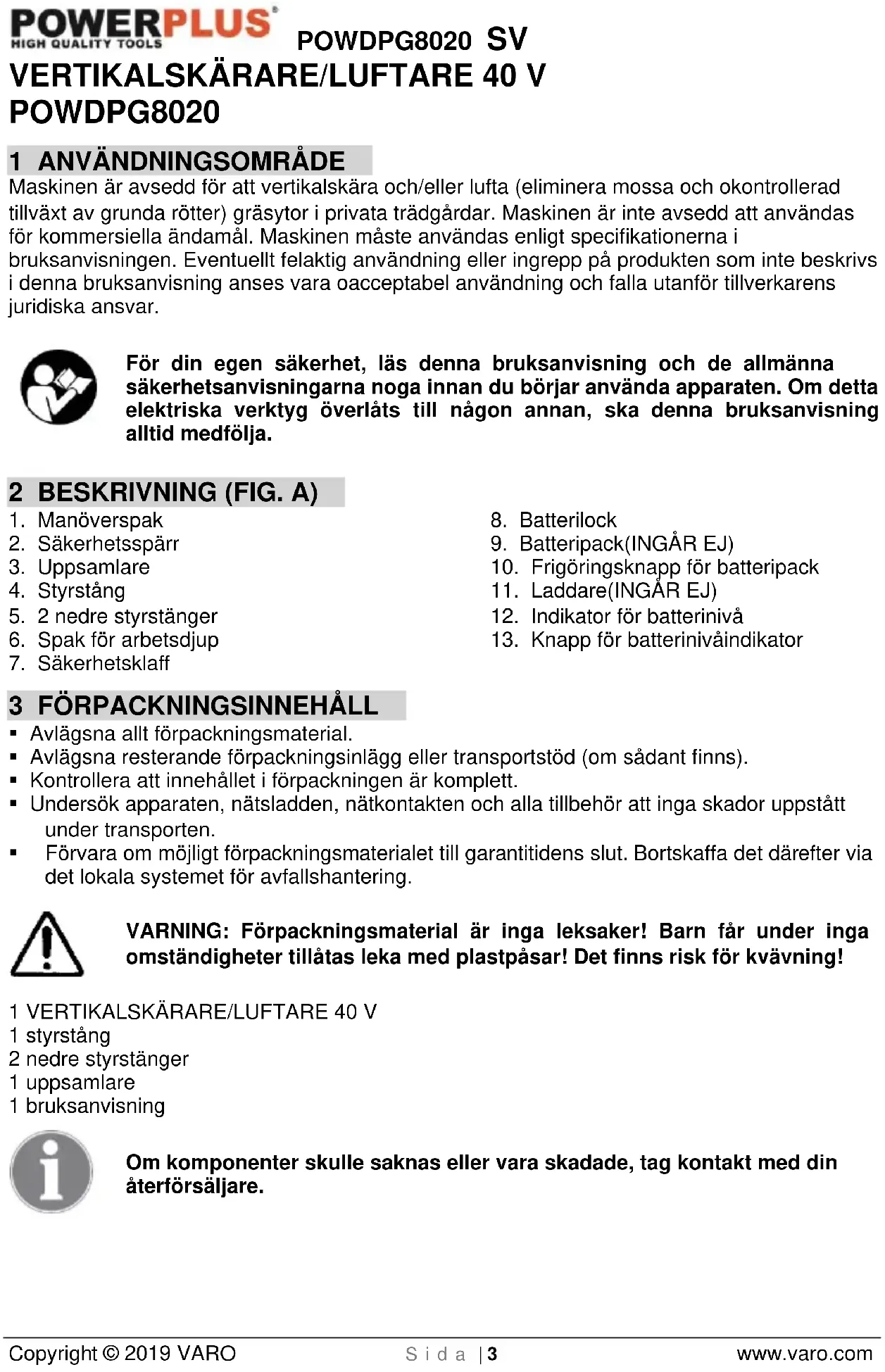 - Använd aldrig maskinen om säkerhetsanordningarna är skadade eller saknas, om till exempel säkerhetsklaff och/eller uppsamlare saknas.POWDPG8020 SV Copyright © 2019 VARO S i d a | 7 www.varo.com