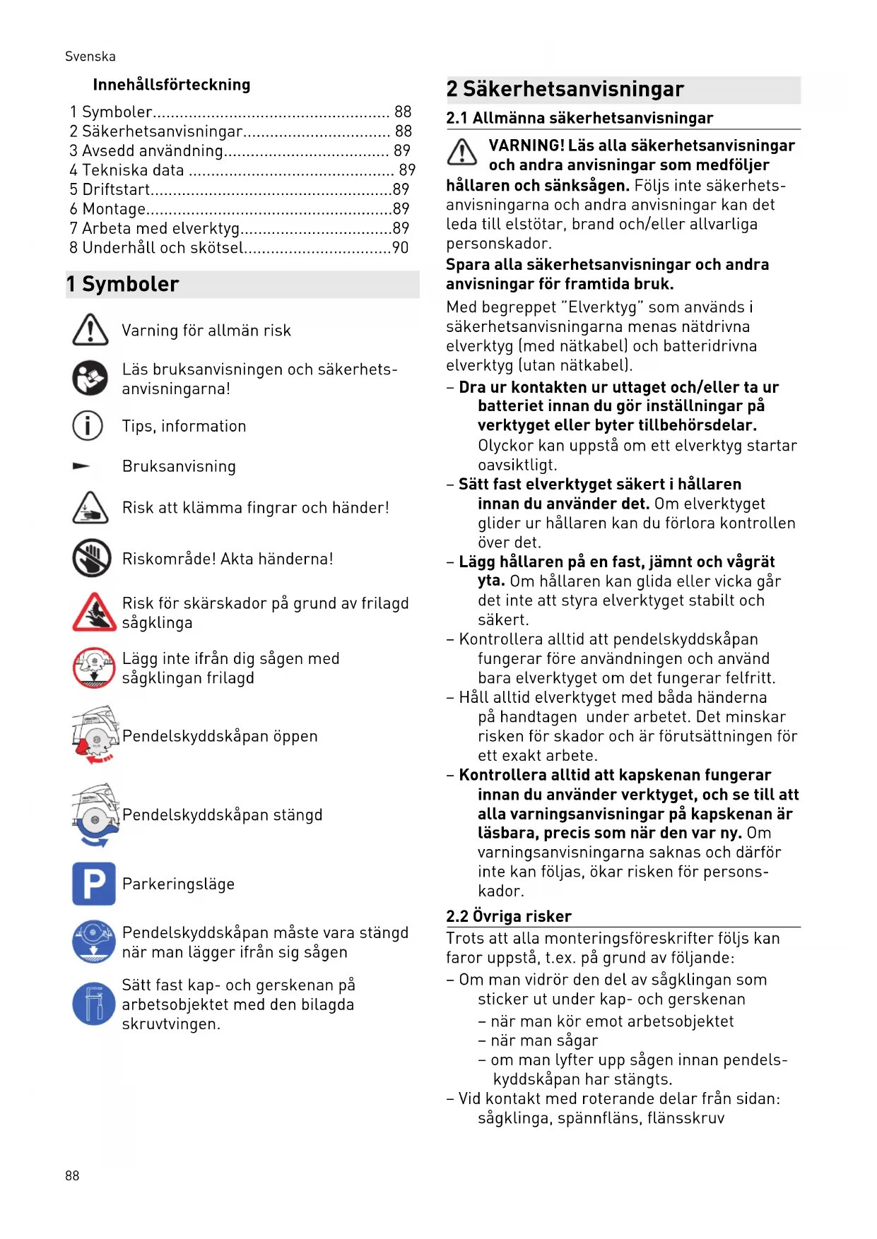 - 8 Underhåll och skötsel 1 Symboler Varning för allmän risk Läs bruksanvisningen och säkerhets anvisningarna! Tips, information Bruksanvisning Risk att klämma fingrar och händer! Riskområde! Akta händerna! Risk för skärskador på grund av frilagd sågklinga Lägg inte ifrån dig sågen med sågklingan frilagd HKC 55 EB www.fe p. 90