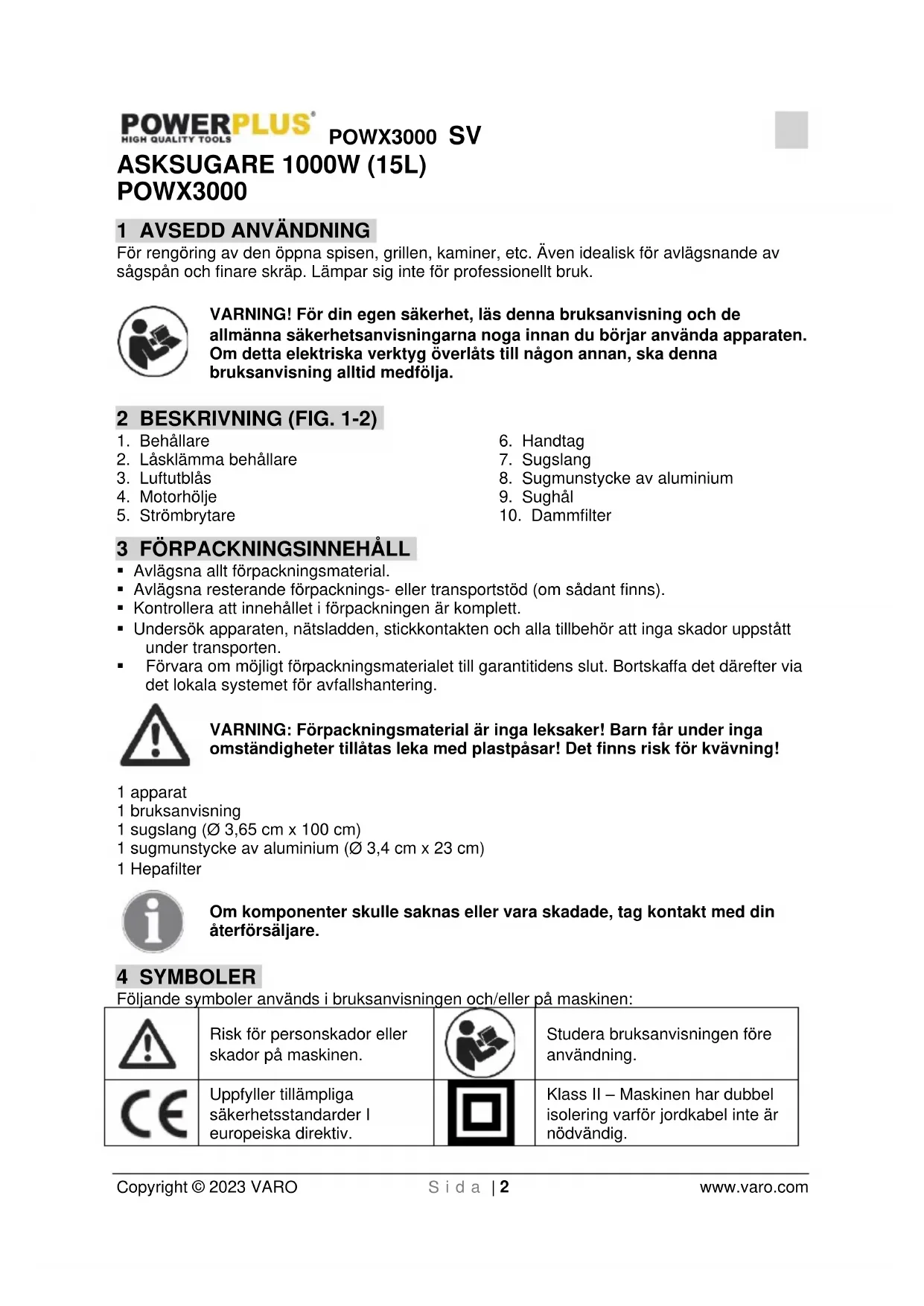 Klass II – Maskinen har dubbel isolering varför jordkabel inte är nödvändig.POWX3000 SV Copyright © 2023 VARO S i d a | 3 www.varo.com 5 ALLMÄNNA SÄKERHETSANVISNINGAR FÖR ELEKTRISKA VERKTYG Studera noga samtliga säkerhetsanvisningar och andra anvisningar. Uraktlåtenhet att följa säkerhetsanvisningar och andra anvisningar kan medföra risk för elektriska stötar, brand och/eller allvarliga personskador. Spar alla säkerhetsanvisningar och andra anvisningar för framtida konsultation. Den nedan använda termen „elektriskt verktyg“ i säkerhetsanvisningarna avser nätdrivna elektriska verktyg (med nätkabel) eller batteridrivna (sladdlösa) elektriska verktyg.
