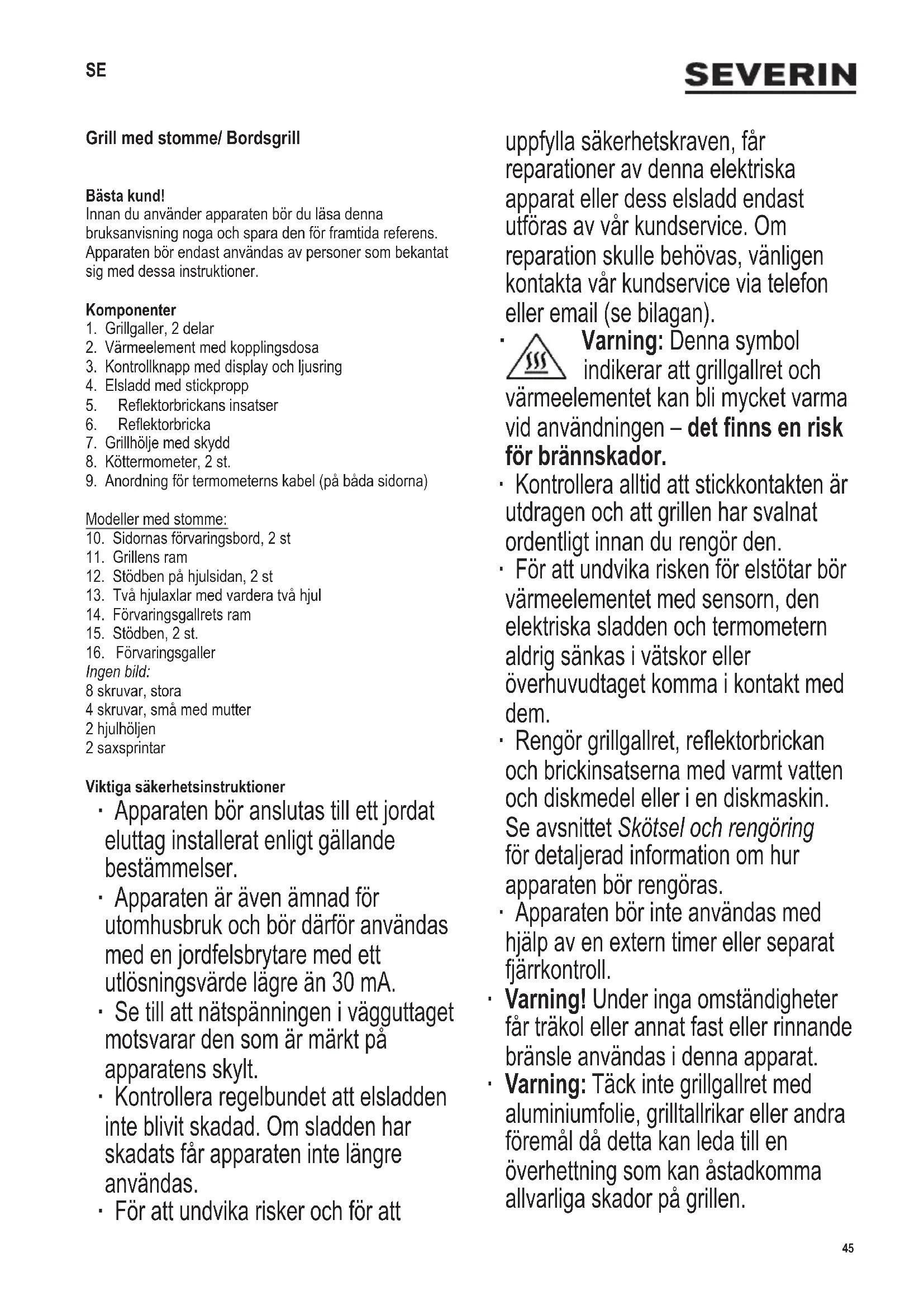 Varning: Denna symbol indikerar att grillgallret och värmeelementet kan bli mycket varma vid användningen – det nns en risk för brännskador. ∙ Kontrollera alltid att stickkontakten är utdragen och att grillen har svalnat ordentligt innan du rengör den. ∙ För att undvika risken för elstötar bör värmeelementet med sensorn, den elektriska sladden och termometern aldrig sänkas i vätskor eller överhuvudtaget komma i kontakt med dem. ∙ Rengörgrillgallret,reektorbrickan och brickinsatserna med varmt vatten och diskmedel eller i en diskmaskin. Se avsnittet Skötsel och rengöring för detaljerad information om hur apparaten bör rengöras. ∙ Apparaten bör inte användas med hjälp av en extern timer eller separat fjärrkontroll. ∙ Varning!Underingaomständigheter får träkol eller annat fast eller rinnande bränsle användas i denna apparat. ∙ Varning: Täck inte grillgallret med aluminiumfolie, grilltallrikar eller andra föremål då detta kan leda till en överhettning som kan åstadkomma allvarliga skador på grillen. SE46 142 x 208 mm ∙ Påreektorbrickankanduhällamax 2,0 l vatten. ∙ Apparaten är avsedd för hemmabruk eller liknande användning, såsom - i personalkök, kontor och andra kommersiella miljöer, - i företag inom jordbrukssektorn, - för gäster i hotell, motell och liknande inkvarteringsställen, - för gäster i bed-and-breakfast hus. ∙ Denna apparat kan användas av barn (minst 8 år gamla) och av personer som har minskad fysisk rörelseförmåga, reducerat sinnes- eller mentaltillstånd, eller som har bristfällig erfarenhet och kunskap, förutsatt att dessa personer är under uppsyn eller har fått tillräckliga instruktioner beträffande apparatens användning och vet vilka risker och säkerhetsåtgärder som användningen innefattar. ∙ Barn bör inte tillåtas leka med apparaten. ∙ Barn bör inte tillåtas rengöra eller göra service på apparaten ifall de inte är övervakade och minst 8 år gamla. ∙ Apparaten och dess elsladd bör hållas utom räckhåll för barn under 8 år. ∙ Varning: Håll barn på avstånd från apparatens förpackningsmaterial eftersom fara eventuellt kan uppstå.Detnnst.ex.riskförkvävning. ∙ Kontrollera noga om det märks några fel på huvudenheten och dess tilläggsutrustning innan apparaten används. Om apparaten t ex har tappats på en hård yta får den inte längre användas: t o m osynliga skador kan försämra apparatens driftsäkerhet. ∙ Underanvändningenbörgrillenplaceraspåen värmebeständigyta,somtålstänkochäckar.Närman tillreder mat som innehåller mycket fett eller vätska kan man ibland inte undvika stänk. ∙ Placera inte grillen nära en vägg eller i en vrå och se till attdetintennslättantändligamaterialinärheten. ∙ Kom ihåg att livsmedel som innehåller mycket fett eller vätska lätt kan antändas; fyll därför alltid reektorbrickan med vatten före användning. Anslut inte grillen till elnätet förrän reektorbrickan har fyllts med vatten. Vattnet hjälper till att kyla ner brickan, minskar eventuellt os och underlättar rengöringen. ∙ Håll vattennivån under kontroll. Fyll på mer vatten i god tid och var noggrann så att vattnet inte kommer i kontakt med värmeelementet. Varning: Koppla alltid grillen från eluttaget innan du fyller på vatten. ∙ Innan grillen används bör ni kontrollera att värmeelementet är korrekt installerat i reektorbrickan och höljet. ∙ Grillen bör alltid användas under övervakning. ∙ Se till att elsladden inte kommer i kontakt med apparatens heta ytor. ∙ Kontrollera elsladdens läge så att ingen kan snava över den. ∙ Dra alltid stickproppen ur vägguttaget - innan du fyller reektorbrickan med vatten, - efter användning, - om apparaten krånglar, - innan du rengör apparaten. ∙ Användning av förlängningskabel eller sladdvinda förorsakar ett spänningsfall och eventuellt även en upphettning inuti kabeln. Det är därför viktigt att rulla ut kabeln fullständigt innan apparaten kopplas på. Kontrollera att förlängningskabeln är godkänd för utomhusbrukochföreffektensomspecicerats(se märkskylten). ∙ Tryck inte mot sidoborden för att ytta grillen. Ta alltid bort sidobordet först och ta tag i grillens stomme. ∙ Använd inte grillens stomme för att transportera saker. ∙ Flytta aldrig grillen medan den används. ∙ Ta bort vattnet efter användning. ∙ Observera! Låt alltid grillen svalna helt och hållet innan duyttar,rengör,övertäckerellerförvararden. ∙ Observera! När grillen inte används måste värmeelementet med anslutningskopplingsdosan tas bort från grillen och förvaras torrt. ∙ De andra delarna av grillen får inte förvaras utomhus eller på öppna platser där de kan påverkas av vädret. ∙ Grillen får bara användas med den medlevererade köttermometern eller SEVERIN-artikelnr ZB 8126. ∙ Inget ansvar godtas om skada uppkommer till följd av felaktig användning, eller om dessa instruktioner inte följts. ∙ Denna produkt uppfyller de krav som är gällande för CE-märkning.47 142 x 208 mm Innan grillen används första gången ∙ Avlägsna apparatens förpackningsmaterial och klistermärken. ∙ Rengörgrillgallret,reektorbrickanochbrickinsatserna med varmt vatten och diskmedel; torka dem torra efteråt. ∙ Montera ihop apparaten enligt beskrivningen i Förberedning av enheten. ∙ Låt grillen värmas upp ca 10 minuter vid maximal effekt utan mat (se Grillning ”Boost-zone”). Detta kommer att ta bort lukten som ofta uppstår när man först sätter igång grillen. Litet rök kan uppstå; vädra därför ordentligt genom att öppna fönster eller balkongdörrar; en köksäktkanocksåfungera. Montering av grillen ∙ Montera ihop grillen enligt bilderna: ∙ Placerareektorbrickanigrillenshölje. ∙ Varning: Montera brickans insatser så att varje insats täcker fyra utbuktningar. ∙ Placera värmeelementet med kopplingsdosan på reektorbrickan.Apparaten