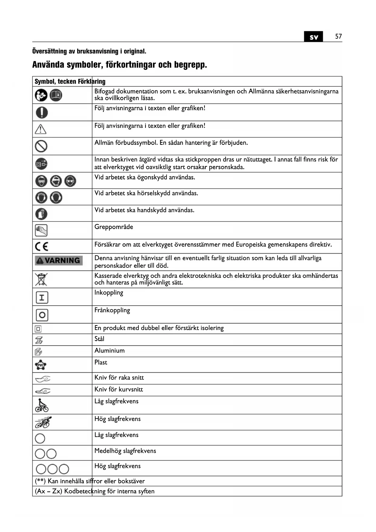Översättning av bruksanvisning i original. Använda symboler, förkortningar och begrepp. Symbol, tecken Förklaring Bifogad dokumentation som t. ex. bruksanvisningen och Allmänna säkerhetsanvisningarna ska ovillkorligen läsas. Följ anvisningarna i texten eller grafiken! Följ anvisningarna i texten eller grafiken! Allmän förbudssymbol. En sådan hantering är förbjuden. Innan beskriven åtgärd vidtas ska stickproppen dras ur nätuttaget. I annat fall finns risk för att elverktyget vid oavsiktlig start orsakar personskada. Vid arbetet ska ögonskydd användas. Vid arbetet ska hörselskydd användas. Vid arbetet ska handskydd användas. Greppområde Försäkrar om att elverktyget överensstämmer med Europeiska gemenskapens direktiv. Denna anvisning hänvisar till en eventuellt farlig situation som kan leda till allvarliga personskador eller till död. Kasserade elverktyg och andra elektrotekniska och elektriska produkter ska omhändertas och hanteras på miljövänligt sätt. Inkoppling Frånkoppling En produkt med dubbel eller förstärkt isolering Stål Aluminium Plast Kniv för raka snitt Kniv för kurvsnitt Låg slagfrekvens Hög slagfrekvens Låg slagfrekvens Medelhög slagfrekvens Hög slagfrekvens (**) Kan innehålla siffror eller bokstäver (Ax – Zx) Kodbeteckning för interna syften58