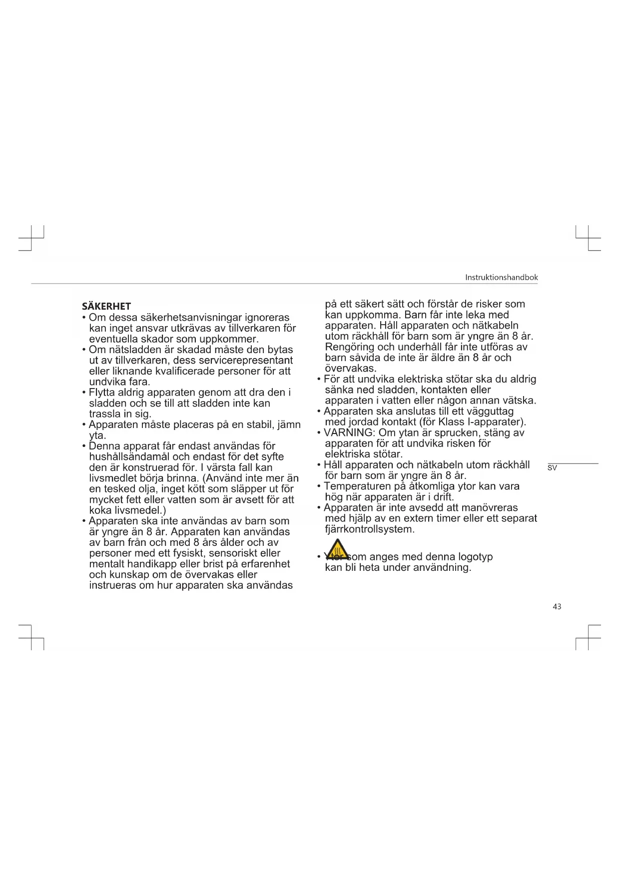 - Sänk aldrig ner apparaten i vatten eller i någon annan vätska. Apparaten kan inte diskas i diskmaskin.Instruktionshandbok
