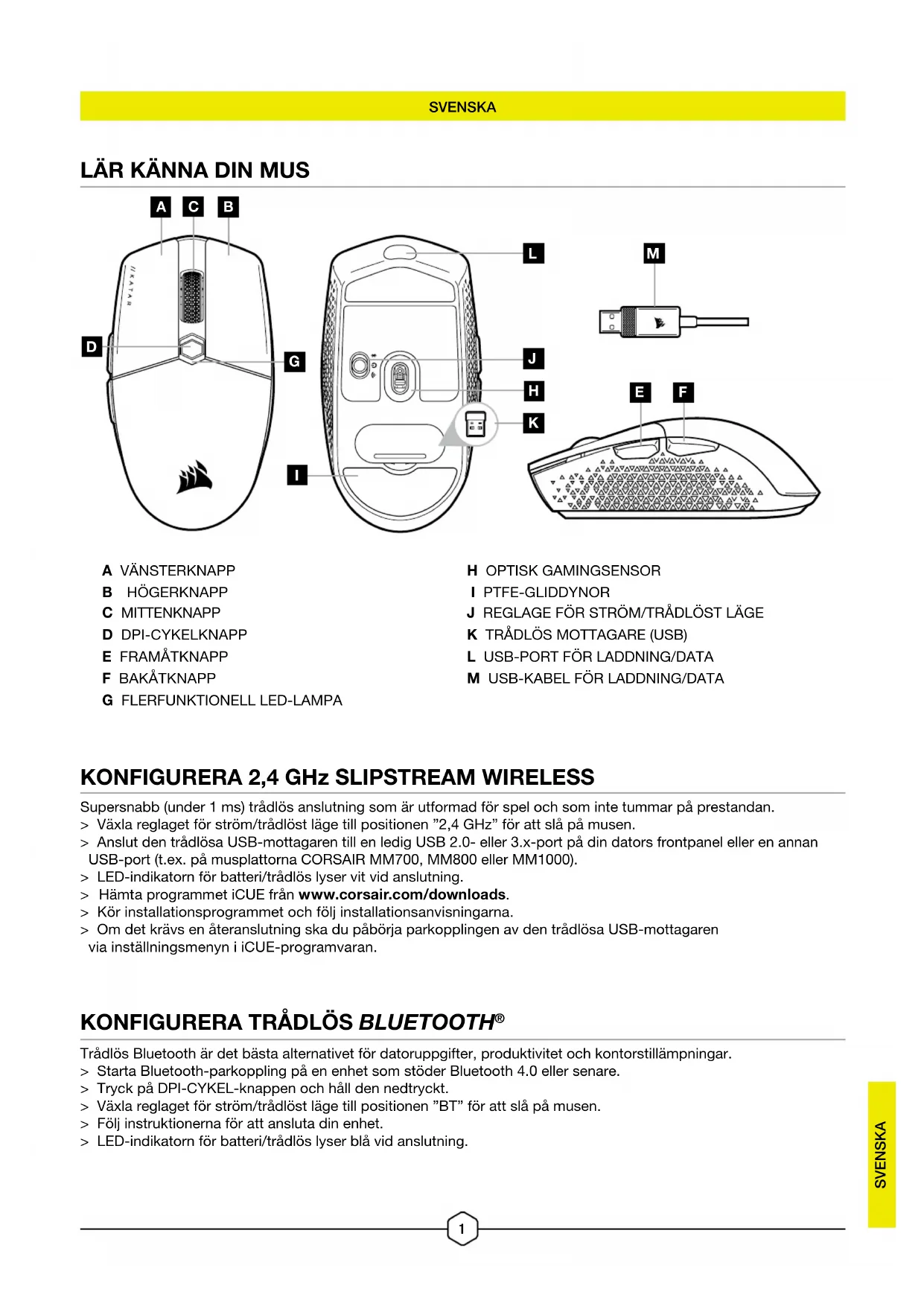 KONFIGURERA 2,4GHz SLIPSTREAM WIRELESS Supersnabb (under 1ms) trådlös anslutning som är utformad för spel och som inte tummar på prestandan. > Växla reglaget för ström/trådlöst läge till positionen ”2,4GHz” för att slå på musen. > Anslut den trådlösa USB-mottagaren till en ledig USB 2.0- eller 3.x-port på din dators frontpanel eller en annan USB-port (t.ex. på musplattorna CORSAIR MM700, MM800 eller MM1000). > LED-indikatorn för batteri/trådlös lyser vit vid anslutning. > Hämta programmet iCUE från www.corsair.com/downloads. > Kör installationsprogrammet och följ installationsanvisningarna. > Om det krävs en återanslutning ska du påbörja parkopplingen av den trådlösa USB-mottagaren via inställningsmenyn i iCUE-programvaran.