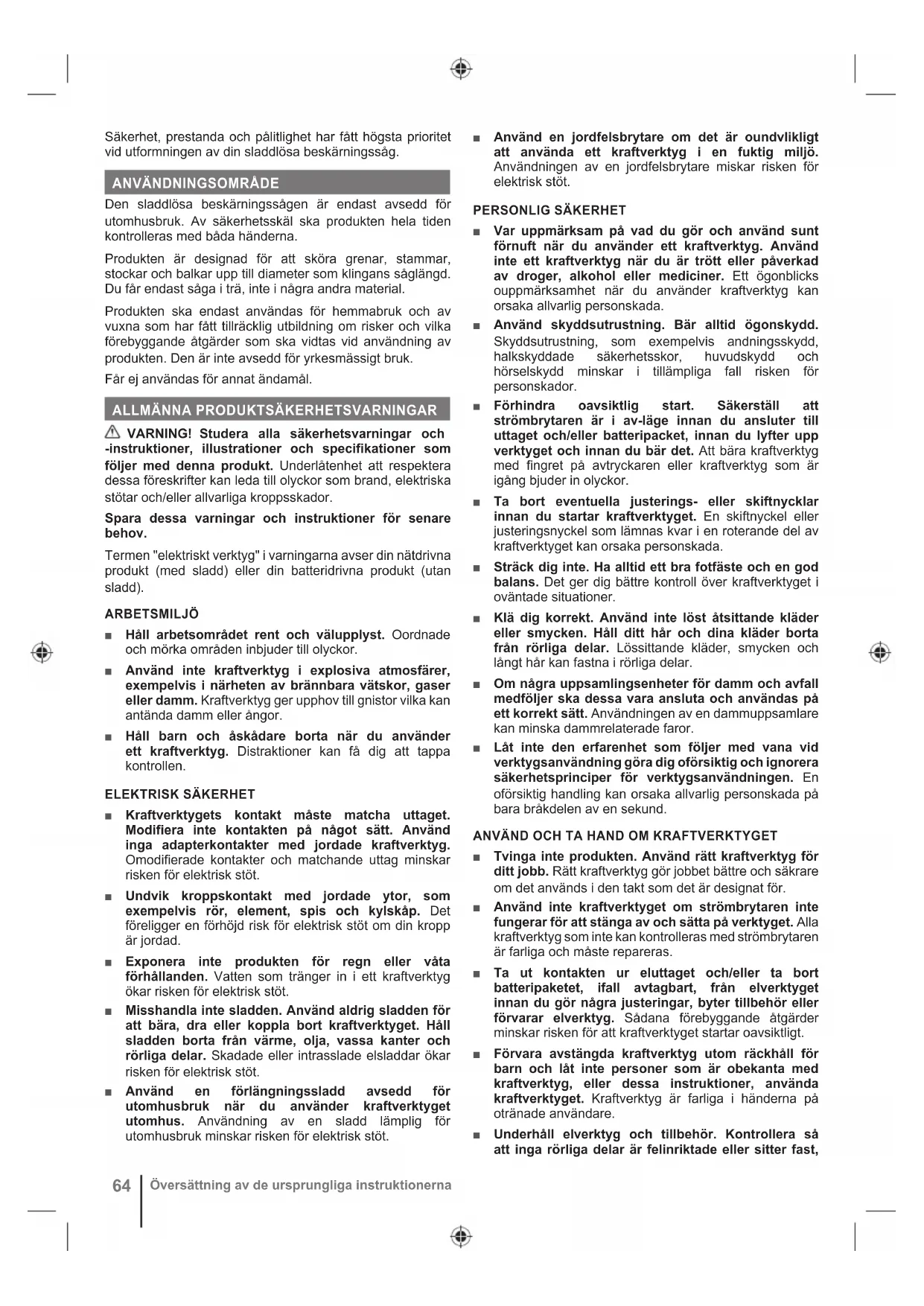 ■ Håll alla delar av kroppen undan från sågkedjan när beskärningssågen är igång. Innan du startar beskärningssågen, säkerställ att sågkedjan inte kommer i kontakt med något. Ett ögonblicks ouppmärksamhet när man använder en beskärningssåg kan göra att kläder eller kroppsdelar fastnar i sågkedjan. ■ Håll alltid beskärningssågen med ena handen på det bakre handtaget och den andra på det främre handtaget. ■ Håll bara i beskärningssågens isolerade greppytor, sågkedjan kan nämligen råka komma i kontakt med dolda ledningar. Sågblad som vidrör en strömförande ledning kan göra beskärningssågens exponerade metalldelar strömförande och användaren kan får en elstöt. ■ Bär ögonskydd Ytterligare skyddsutrustning för hörsel, huvud, händer, ben och fötter rekommenderas. Adekvat skyddsutrustning kommer att minska risken för personskador orsakade av flygande skräp eller oavsiktlig kontakt med sågkedjan. ■ Använd inte beskärningssågen om du är uppe i ett träd, på en stege, på ett hustak eller när underlaget inte är stabilt. Att använda beskärningssågen så kan resultera i allvarlig personskada. ■ Placera bägge fötterna stadigt och använd beskärningssågen endast när du står på fast, säkert och plant underlag. Hala eller ostabila underlag kan göra att du tappar balansen eller kontrollen över beskärningssågen. ■ Vid kapning av grenar som är belastade ska du vara beredd på att den kan fjädra tillbaka. När spänningen i grenens träfibrer frigörs kan den träffa operatören och/ eller göra beskärningssågen okontrollerbar. ■ Var extremt försiktig när du kapar buskar och skott. Det tunnare materialet kan fastna i kedjan och piska till mot dig eller dra dig ur balans. ■ Bär beskärningssågen, som ska vara avstängd, i det bakre handtaget och undan från kroppen. Vid transport eller förvaring av beskärningssågen, sätt alltid på skyddet på sågsvärdet. Korrekt hantering av beskärningssågen minskar risken för oavsiktlig kontakt med sågkedjan när den är igång. ■ Följ anvisningar för smörjning, kedjespänning och utbyte av stång och kedja. Felaktigt spänd eller smord kedja kan antingen gå av eller öka risken för bakslag. ■ Kapa enbart trä. Använd inte beskärningssågen för andra ändamål än de avsedda. Exempelvis: använd inte beskärningssågen för sågning i metall, plast, byggnadssten eller byggnadsmaterial som inte är av trä. Att använda beskärningssågen för andra ändamål än de avsedda kan medföra fara. ■ Beskärningssågen är inte avsedd för trädfällning. Användning av beskärningssågen för andra ändamål än de avsedda kan resultera i allvarlig personskada på operatören eller personer i närheten. ■ Följ alla instruktioner vid avlägsnande av material som fastnat, vid förvaring och vid underhåll av beskärningssågen. Försäkra dig om att strömbrytaren är avstängd och att batteripaketet har tagits ut. Oväntad igångsättning av beskärningssågen vid avlägsnade av material som fastnat eller vid underhåll kan resultera i allvarlig personskada. ORSAKER OCH FÖRHINDRAN AV BAKSLAG: Ett kast kan uppstå när spetsen på svärdet rör vid ett föremål eller om kedjan kilas fast i träet under arbetet.66 Översättning av de ursprungliga instruktionerna Vidröring med spetsen kan orsaka en plötslig omvänd reaktion, slå klingan bakåt och uppåt mot användaren. Om man nyper sågkedjan längs översidan av guidestaven så kan guidestaven tryckas tillbaka mot operatören. Båda dessa reaktioner kan medföra förlorad kontroll över sågen, och innebär risk för svåra skador. Förlita dig inte enbart på sågens inbyggda säkerhetsfunktioner. Du som använder beskärningssågen ska vidta fl era steg för att undvika olyckor och personskador i samband med sågningen. Återstuds beror på felaktig användning av beskärningssågen och/eller felaktiga driftsförfaranden eller förhållanden och kan undvikas genom att nödvändiga försiktighetsåtgärder vidtas, se nedan: ■ Håll hela tiden beskärningssågen med händerna runt det bakre handtaget, bägge händerna på sågen och placera kroppen och armen så att du kan hålla emot återstuds. Kraften i bakslag kan kontrolleras av användaren om man vidtar korrekta försiktighetsåtgärder. Släpp inte taget om beskärningssågen. ■ Sträck dig inte och kapa inte ovanför axelhöjd. Då kan oavsiktlig kontakt med spetsen undvikas, och du har bättre kontroll över beskärningssågen i oväntade situationer. ■ Använd endast reservstyrskenor och reservsågkedjor som anges av tillverkaren. Olämpliga reservstyrskenor och reservsågkedjor kan orsaka kedjebrott och/eller återstuds. ■ Följ tillverkarens anvisningar beträffande slipning och skötsel av sågkedjan. Minskning av djupet kan leda till ökade bakslag.