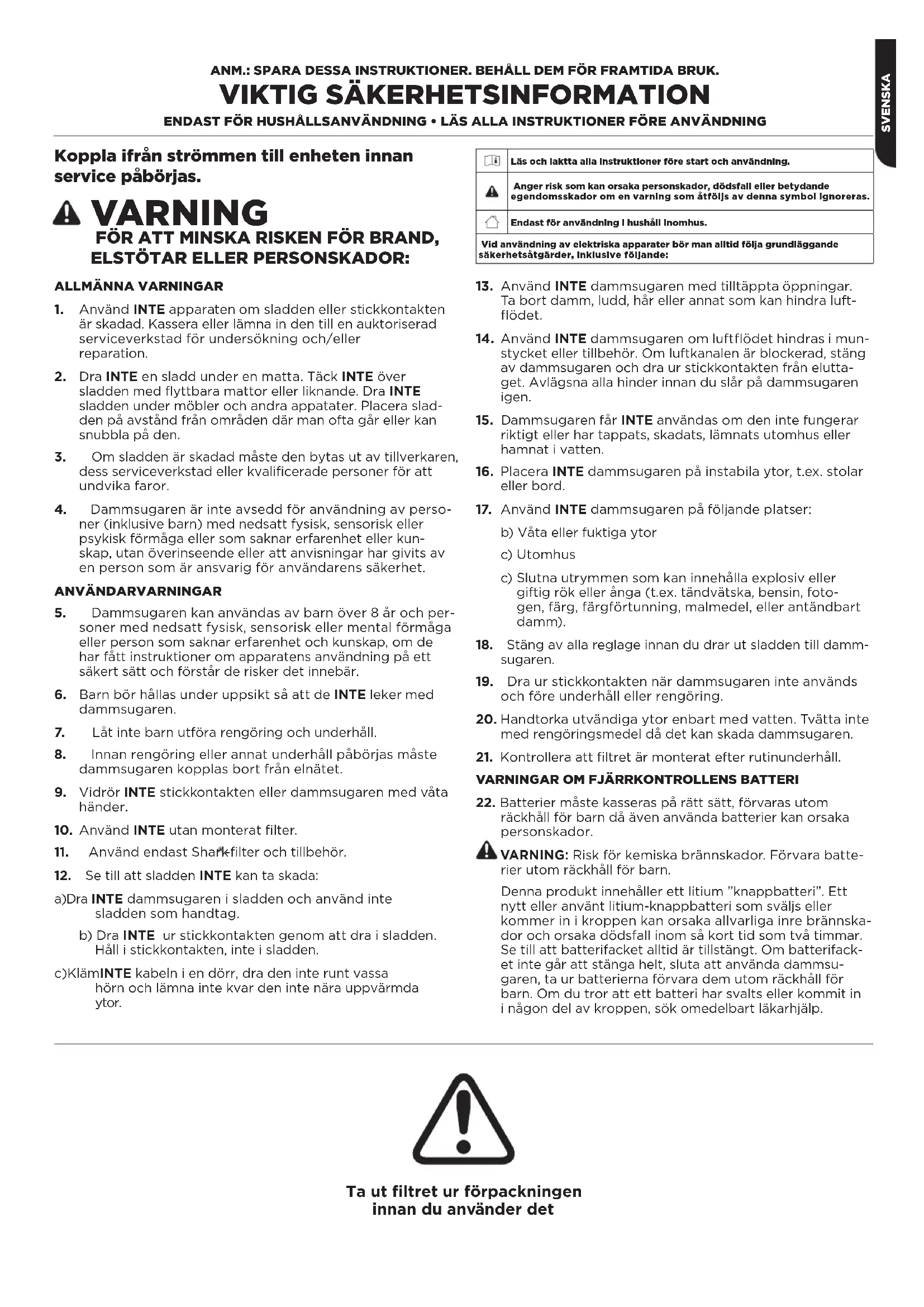 räckhåll för barn då även använda batterier kan orsaka personskador. VARNING: Risk för kemiska brännskador. Förvara batte- rier utom räckhåll för barn. Denna produkt innehåller ett litium ”knappbatteri”. Ett nytt eller använt litium-knappbatteri som sväljs eller kommer in i kroppen kan orsaka allvarliga inre brännska- dor och orsaka dödsfall inom så kort tid som två timmar. Se till att batterifacket alltid är tillstängt. Om batterifack- et inte går att stänga helt, sluta att använda dammsu- garen, ta ur batterierna förvara dem utom räckhåll för barn. Om du tror att ett batteri har svalts eller kommit in i någon del av kroppen, sök omedelbart läkarhjälp. Koppla ifrån strömmen till enheten innan service påbörjas. VARNING FÖR ATT MINSKA RISKEN FÖR BRAND, ELSTÖTAR ELLER PERSONSKADOR: Ta ut filtret ur förpackningen innan du använder det Läs och iaktta alla instruktioner före start och användning. Anger risk som kan orsaka personskador, dödsfall eller betydande egendomsskador om en varning som åtföljs av denna symbol ignoreras.Endast för användning i hushåll inomhus. Vid användning av elektriska apparater bör man alltid följa grundläggande säkerhetsåtgärder, inklusive följande:SVENSKA KONFIGURERA APPARATEN Delar:
