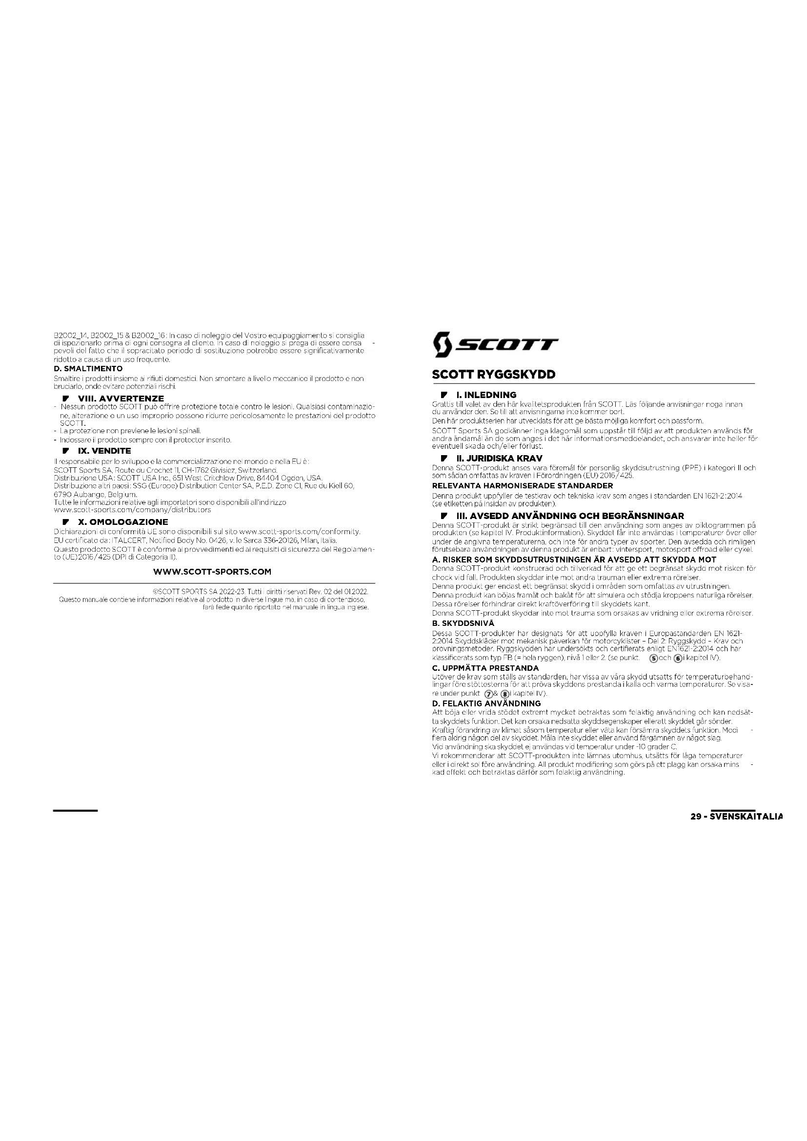 - III. AVSEDD ANVÄNDNING OCH BEGRÄNSNINGAR Denna SCOTT-produkt är strikt begränsad till den användning som anges av piktogrammen på produkten (se kapitel IV. Produktinformation). Skyddet får inte användas i temperaturer över eller under de angivna temperaturerna, och inte för andra typer av sporter. Den avsedda och rimligen förutsebara användningen av denna produkt är enbart : vintersport, motosport offroad eller cykel. A. RISKER SOM SKYDDSUTRUSTNINGEN ÄR AVSEDD ATT SKYDDA MOT Denna SCOTT-produkt konstruerad och tillverkad för att ge ett begränsat skydd mot risken för chock vid fall. Produkten skyddar inte mot andra trauman eller extrema rörelser. Denna produkt ger endast ett begränsat skydd i områden som omfattas av utrustningen. Denna produkt kan böjas framåt och bakåt för att simulera och stödja kroppens naturliga rörelser. Dessa rörelser förhindrar direkt kraftöverföring till skyddets kant. Denna SCOTT-produkt skyddar inte mot trauma som orsakas av vridning eller extrema rörelser. B. SKYDDSNIVÅ Dessa SCOTT-produkter har designats för att uppfylla kraven i Europastandarden EN 1621- 2:2014 Skyddskläder mot mekanisk påverkan för motorcyklister – Del 2: Ryggskydd – Krav och provningsmetoder. Ryggskydden har undersökts och certifierats enligt EN 1621-2:2014 och har klassificerats som typ FB (= hela ryggen), nivå 1 eller 2. (se punkt. och i kapitel IV).