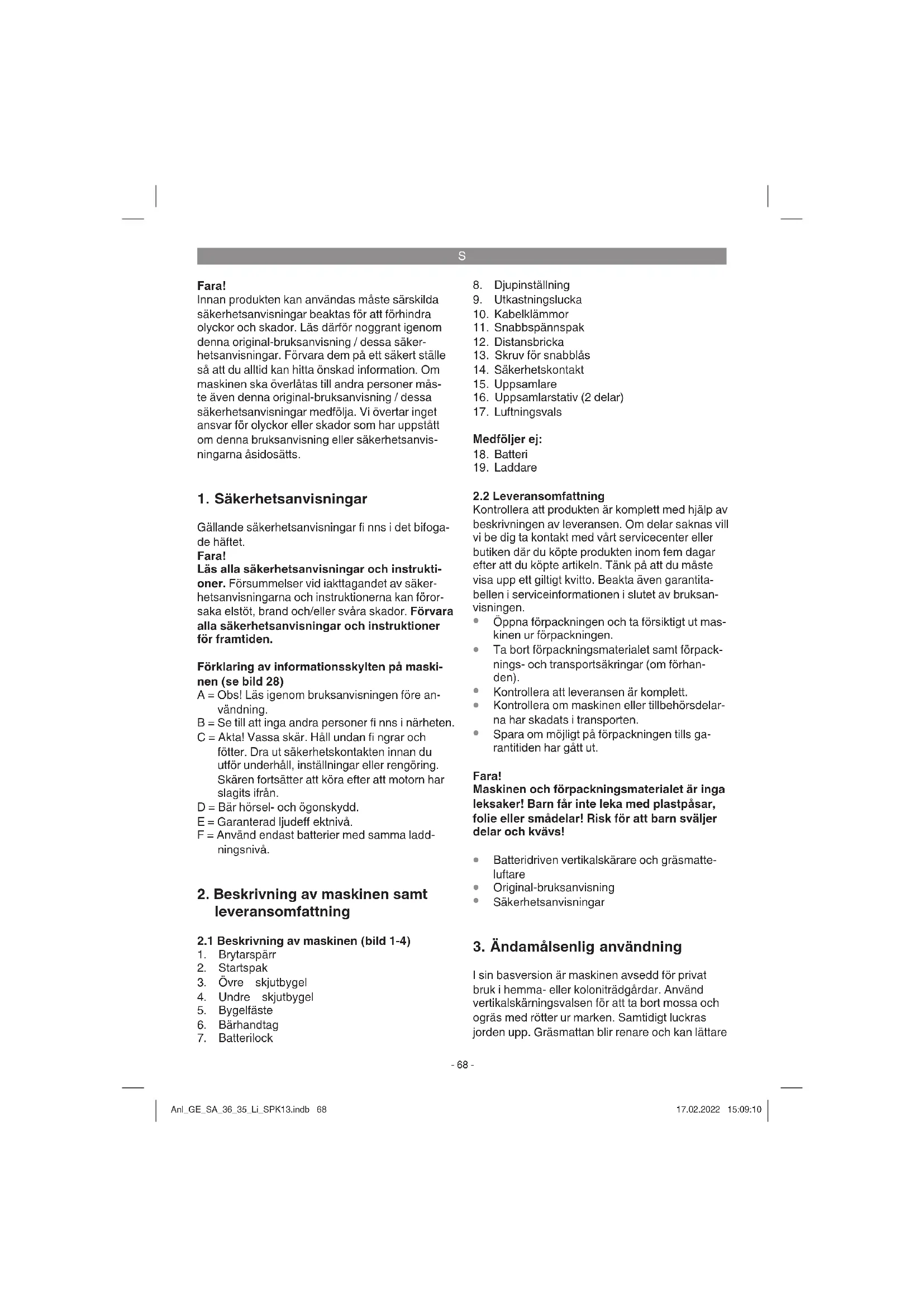 I sin basversion är maskinen avsedd för privat bruk i hemma- eller koloniträdgårdar. Använd vertikalskärningsvalsen för att ta bort mossa och ogräs med rötter ur marken. Samtidigt luckras jorden upp. Gräsmattan blir renare och kan lättare Anl_GE_SA_36_35_Li_SPK13.indb 68Anl_GE_SA_36_35_Li_SPK13.indb 68 17.02.2022 15:09:1017.02.2022 15:09:10S