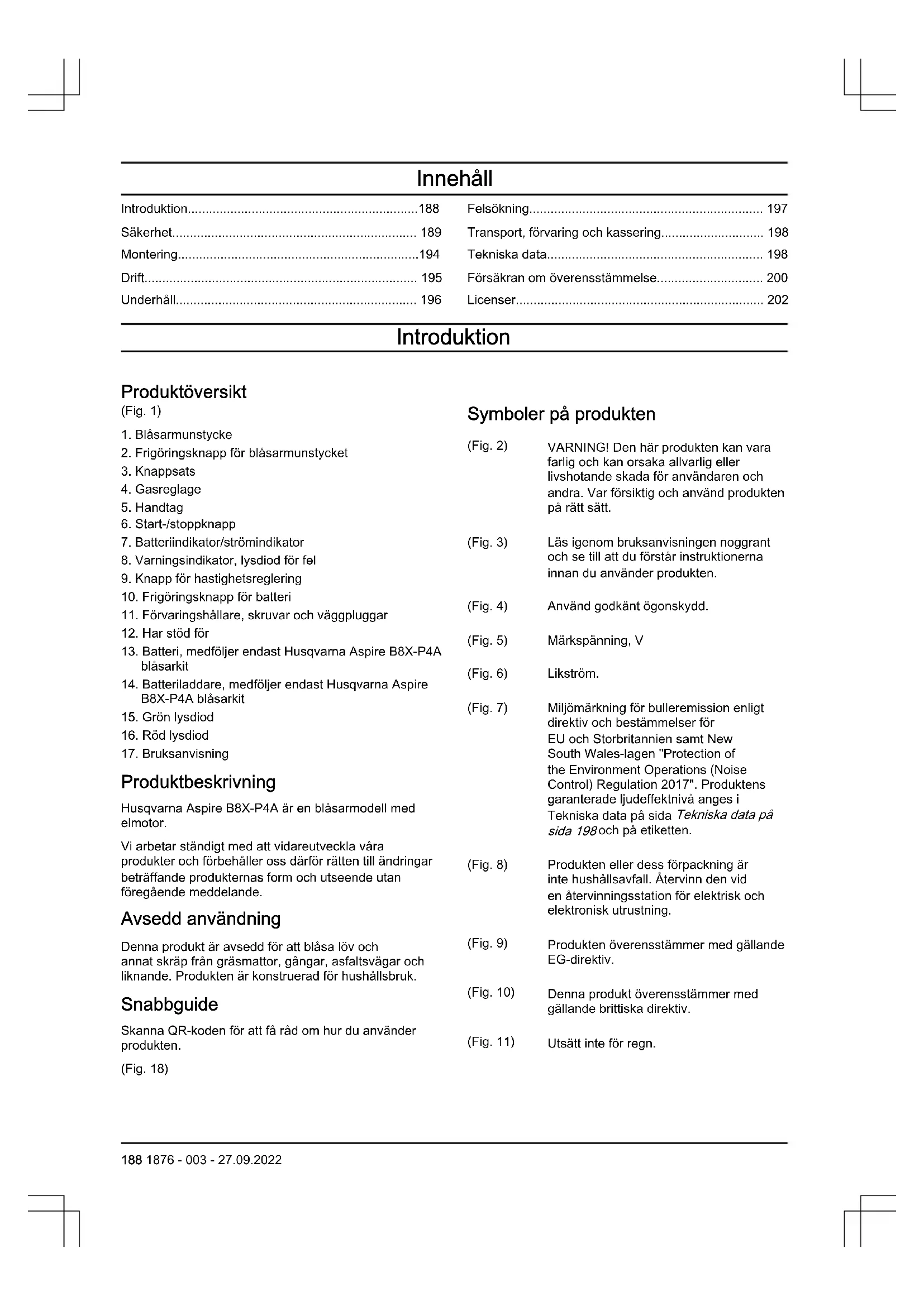 Produktbeskrivning Husqvarna Aspire B8X-P4A är en blåsarmodell med elmotor. Vi arbetar ständigt med att vidareutveckla våra produkter och förbehåller oss därför rätten till ändringar beträffande produkternas form och utseende utan föregående meddelande. Avsedd användning Denna produkt är avsedd för att blåsa löv och annat skräp från gräsmattor, gångar, asfaltsvägar och liknande. Produkten är konstruerad för hushållsbruk. Snabbguide Skanna QR-koden för att få råd om hur du använder produkten. (Fig. 18) Symboler på produkten (Fig. 2) VARNING! Den här produkten kan vara farlig och kan orsaka allvarlig eller livshotande skada för användaren och andra. Var försiktig och använd produkten på rätt sätt. (Fig. 3) Läs igenom bruksanvisningen noggrant och se till att du förstår instruktionerna innan du använder produkten. (Fig. 4) Använd godkänt ögonskydd. (Fig. 5) Märkspänning, V (Fig. 6) Likström. (Fig. 7) Miljömärkning för bulleremission enligt direktiv och bestämmelser för EU och Storbritannien samt New South Wales-lagen "Protection of the Environment Operations (Noise Control) Regulation 2017". Produktens garanterade ljudeffektnivå anges i Tekniska data på sida Tekniska data på sida 198 och på etiketten. (Fig. 8) Produkten eller dess förpackning är inte hushållsavfall. Återvinn den vid en återvinningsstation för elektrisk och elektronisk utrustning. (Fig. 9) Produkten överensstämmer med gällande EG-direktiv. (Fig. 10) Denna produkt överensstämmer med gällande brittiska direktiv. (Fig. 11) Utsätt inte för regn. 188 1876 - 003 - 27.09.2022(Fig. 15) Användaren ska se till att inga män- niskor eller djur kommer närmare än 15 meter. Om flera användare arbe- tar på samma plats ska säkerhetsav- ståndet vara minst 15 meter. Blåsaren kan våldsamt kasta iväg föremål som kan studsa tillbaka. Detta kan leda till allvarliga ögonskador om inte rekom- menderad skyddsutrustning används. åååå vvxxxxx Typskylten visar serienumret. åååå är produktionsåret och vv är produktions- veckan. Notera: Övriga på produkten angivna symboler/ dekaler avser specifika krav för certifieringar på vissa marknader. Symboler på batteriet eller på batteriladdaren (Fig. 16) Återvinn produkten vid en återvinnings- station för elektrisk och elektronisk ut- rustning. (Gäller en- dast Europa) (Fig. 17) Använd endast batte- riet i produkter från