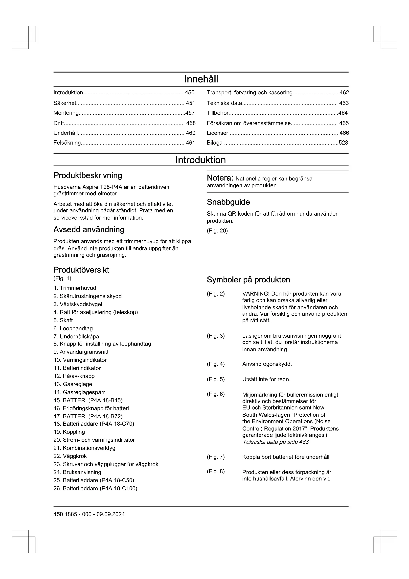- Bilaga Introduktion Produktbeskrivning Husqvarna Aspire T28-P4A är en batteridriven grästrimmer med elmotor. Arbetet med att öka din säkerhet och effektivitet under användning pågår ständigt. Prata med en serviceverkstad för mer information. Avsedd användning Produkten används med ett trimmerhuvud för att klippa gräs. Använd inte produkten till andra uppgifter än grästrimning och gräsröjning. Notera: Nationella regler kan begränsa användningen av produkten. Snabbguide Skanna QR-koden för att få råd om hur du använder produkten. (Fig. 20) Produktöversikt (Fig. 1) p. 528