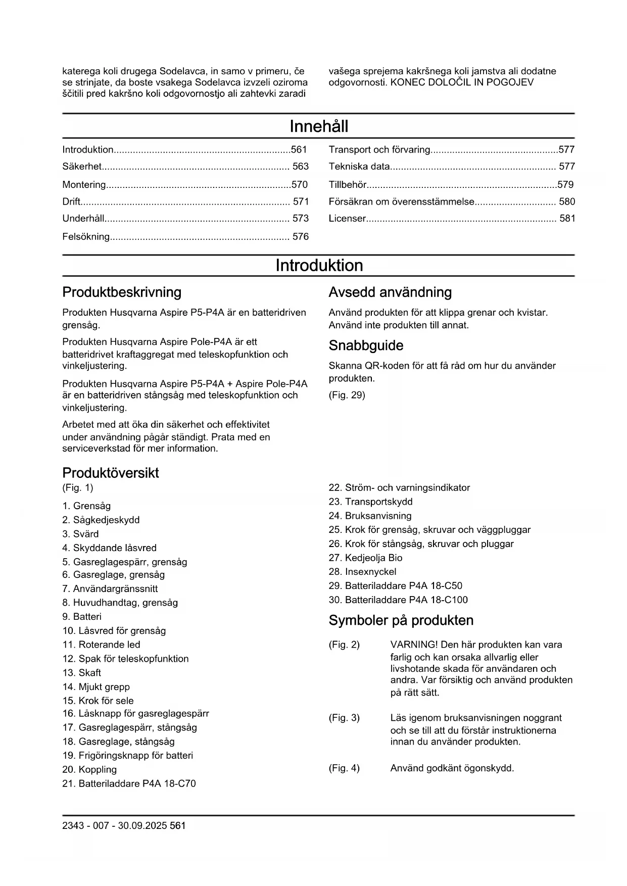 - Licenser Introduktion Produktbeskrivning Produkten Husqvarna Aspire P5-P4A är en batteridriven grensåg. Produkten Husqvarna Aspire Pole-P4A är ett batteridrivet kraftaggregat med teleskopfunktion och vinkeljustering. Produkten Husqvarna Aspire P5-P4A + Aspire Pole-P4A är en batteridriven stångsåg med teleskopfunktion och vinkeljustering. Arbetet med att öka din säkerhet och effektivitet under användning pågår ständigt. Prata med en serviceverkstad för mer information. Avsedd användning Använd produkten för att klippa grenar och kvistar. Använd inte produkten till annat. Snabbguide Skanna QR-koden för att få råd om hur du använder produkten. (Fig. 29) Produktöversikt (Fig. 1) p. 581