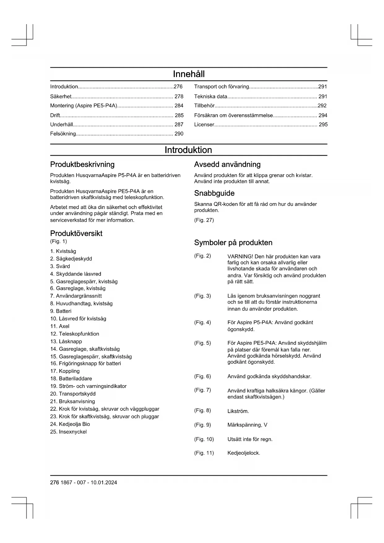 Symboler på produkten (Fig. 2) VARNING! Den här produkten kan vara farlig och kan orsaka allvarlig eller livshotande skada för användaren och andra. Var försiktig och använd produkten på rätt sätt. (Fig. 3) Läs igenom bruksanvisningen noggrant och se till att du förstår instruktionerna innan du använder produkten. (Fig. 4) För Aspire P5-P4A: Använd godkänt ögonskydd. (Fig. 5) För Aspire PE5-P4A: Använd skyddshjälm på platser där föremål kan falla ner. Använd godkända hörselskydd. Använd godkänt ögonskydd. (Fig. 6) Använd godkända skyddshandskar. (Fig. 7) Använd kraftiga halksäkra kängor. (Gäller endast skaftkvistsågen.) (Fig. 8) Likström. (Fig. 9) Märkspänning, V (Fig. 10) Utsätt inte för regn. (Fig. 11) Kedjeoljelock. 276 1867 - 007 - 10.01.2024(Fig. 12) Rotationsriktning, sågkedja. (Fig. 13) Risk för skador. Håll händerna borta från sågkedjan. (Fig. 14) Vrid åt vänster för att lossa vredet, och vrid åt höger för att dra åt vredet. (Fig. 15) Produkten överensstämmer med gällande EU-direktiv. (Fig. 16) Denna produkt överensstämmer med gällande brittiska direktiv. (Fig. 17) Miljömärkning för bulleremission enligt direktiv och bestämmelser för EU och Storbritannien samt New South Wales-lagen "Protection of the Environment Operations (Noise Control) Regulation 2017". Produktens garanterade ljudeffektnivå anges i Tekniska data på sida Tekniska data på sida 291 och på etiketten. (Fig. 18) Produkten eller dess förpackning är inte hushållsavfall. Återvinn den vid en återvinningsstation för elektrisk och elektronisk utrustning. (Fig. 21) Produkten är inte elektriskt isolerad. Om produkten kommer i kontakt med eller i närheten av spänningsförande ledningar kan detta resultera i dödsfall eller all- varlig skada. Elektricitet kan överföras från en punkt till en annan med en så kallad spänningsbåge. Ju högre spänningen är, desto längre kan elektriciteten överföras. Elektricitet kan även överföras genom grenar och andra föremål, sär- skilt om de är blöta. Håll alltid ett avstånd på minst 10meter mellan produkten och spänningsförande ledningar och/eller föremål som är i kontakt med dem. Om du måste arbeta med kortare säkerhetsavstånd ska du alltid kontakta aktuellt kraftbolag för att säkerställa att spänningen är frånslagen innan du påbörjar ditt arbete. Användaren av produkten måste under arbetets gång se till att inga människor eller djur kommer närmare än 15meter. (Gäller endast skaftkvistsågen.) (Fig. 22) Typskylten eller laserskriften visar serienumret. yyyy är produktionsåret och ww är produktionsveckan. Notera: Övriga på produkten angivna symboler/ dekaler avser specifika krav för certifieringar på vissa marknader. Symboler på batteriet eller på batteriladdaren (Fig. 23) Återvinn produkten vid en återvinnings- station för elektrisk och elektronisk ut- rustning. (Gäller en- dast Europa) (Fig. 24) Använd endast batte- riet i produkter från