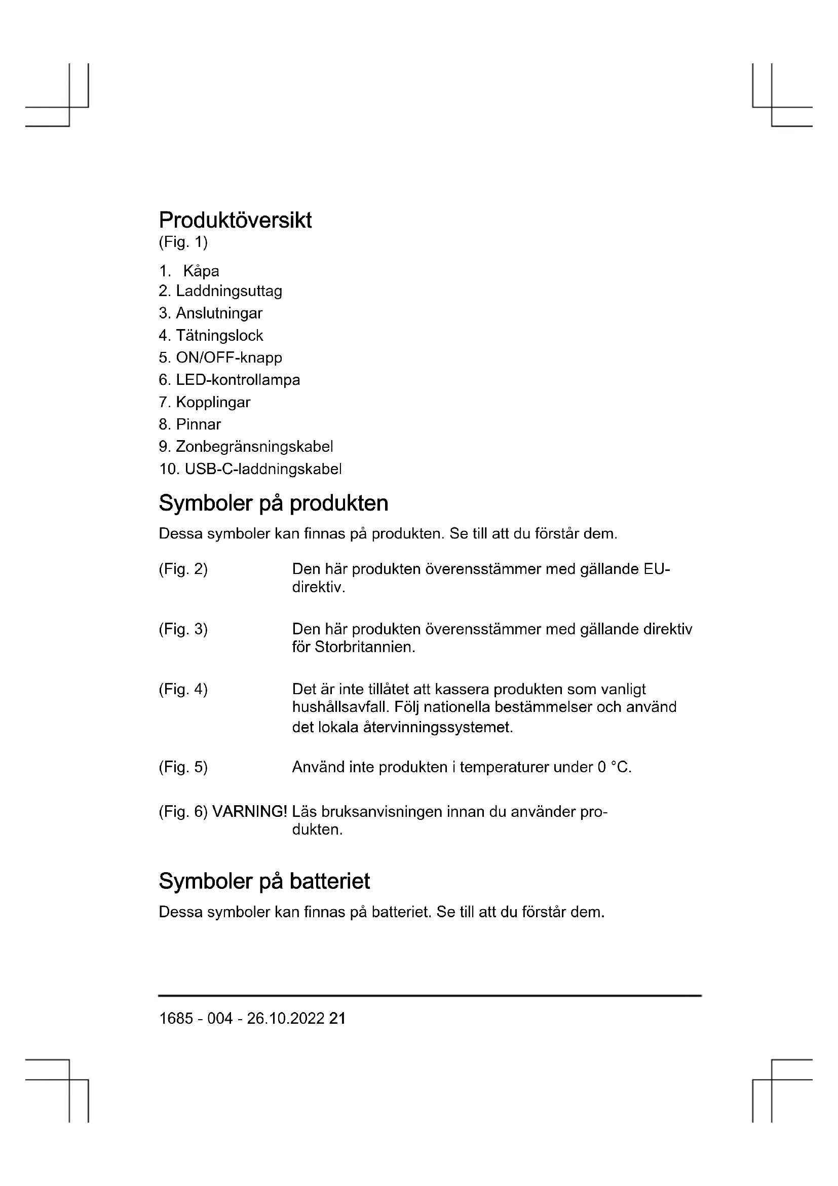 Symboler på produkten Dessa symboler kan finnas på produkten. Se till att du förstår dem. (Fig. 2) Den här produkten överensstämmer med gällande EU- direktiv. (Fig. 3) Den här produkten överensstämmer med gällande direktiv för Storbritannien. (Fig. 4) Det är inte tillåtet att kassera produkten som vanligt hushållsavfall. Följ nationella bestämmelser och använd det lokala återvinningssystemet. (Fig. 5) Använd inte produkten i temperaturer under 0°C. (Fig. 6) VARNING! Läs bruksanvisningen innan du använder pro- dukten. Symboler på batteriet Dessa symboler kan finnas på batteriet. Se till att du förstår dem. 1685 - 004 - 26.10.2022 21(Fig. 7) VARNING! Kasta inte batteriet som vanligt hushållsavfall. Batteriet innehåller litiumjonceller. Säkerhet Säkerhetsdefinitioner Varningar, försiktighetsåtgärder och anmärkningar används för att betona speciellt viktiga delar i bruksanvisningen. VARNING: Används om det finns risk för skador eller dödsfall för användaren eller kringstående om anvisningarna i bruksanvisningen inte följs. OBSERVERA: Används om det finns risk för skada på produkten, annat material eller det angränsande området om anvisningarna i bruksanvisningen inte följs. Notera: Används för att ge mer information som är nödvändig i en viss situation. Säkerhetsinstruktioner för drift VARNING: Läs varningsinstruktionerna nedan innan du använder produkten.