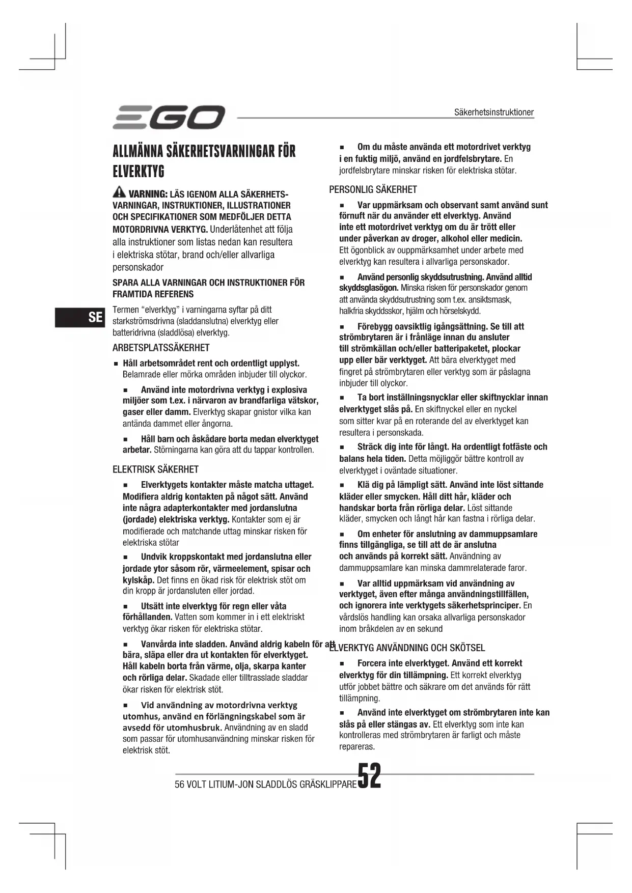 GRÄSKLIPPARE FARA: Denna maskin har byggts för att arbeta i enlighet med reglerna för säker drift som inkluderas i denna manual. Såsom med alla typer av elutrustning kan oförsiktighet eller fel hos operatören resultera i allvarliga skador. Denna maskin kan skadad händer och fötter och kasta iväg föremål. Underlåtenhet att följa dessa säkerhetsinstruktioner kan resultera i allvarlig skada eller dödsfall. VARNING: När sladdlösa gräsklipparen används skall grundläggande säkerhetsföreskrifter alltid följas för att minska risken för brand, elektriska faror och skador på personer.56 VOLT LITIUM-JON SLADDLÖS GRÄSKLIPPARE54
