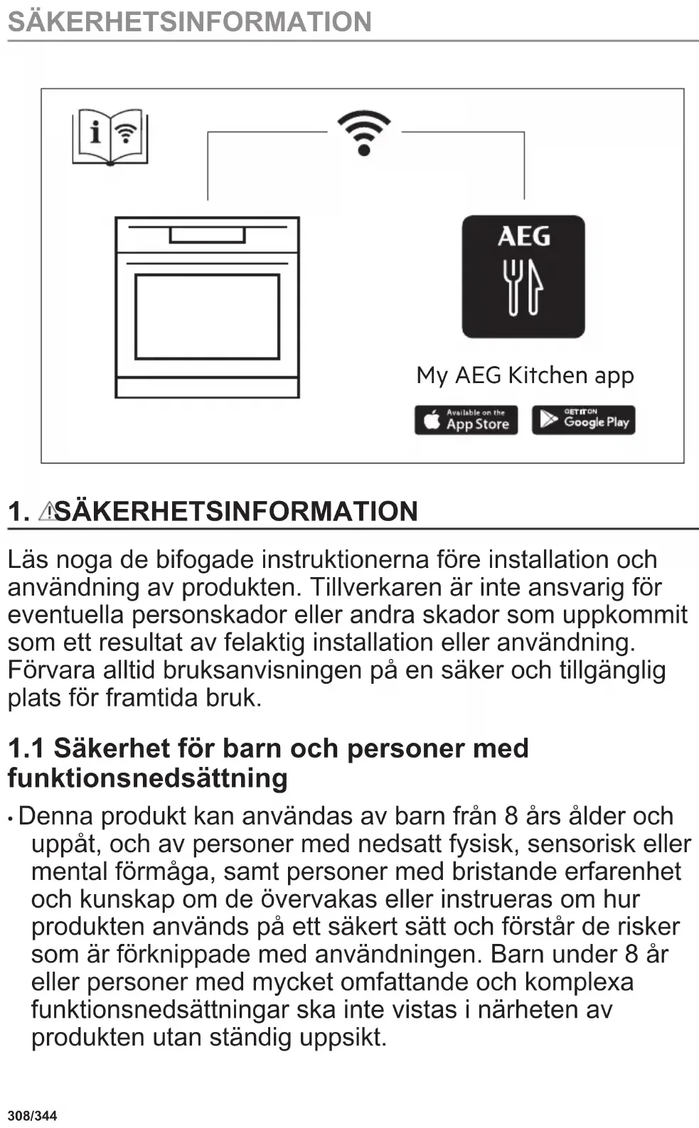 - Denna produkt kan användas av barn från 8 års ålder och uppåt, och av personer med nedsatt fysisk, sensorisk eller mental förmåga, samt personer med bristande erfarenhet och kunskap om de övervakas eller instrueras om hur produkten används på ett säkert sätt och förstår de risker som är förknippade med användningen. Barn under 8 år eller personer med mycket omfattande och komplexa funktionsnedsättningar ska inte vistas i närheten av produkten utan ständig uppsikt. 308/344 SÄKERHETSINFORMATION• Barn ska hållas under uppsikt så att de inte leker med produkten och mobilenheter med My AEG Kitchen .