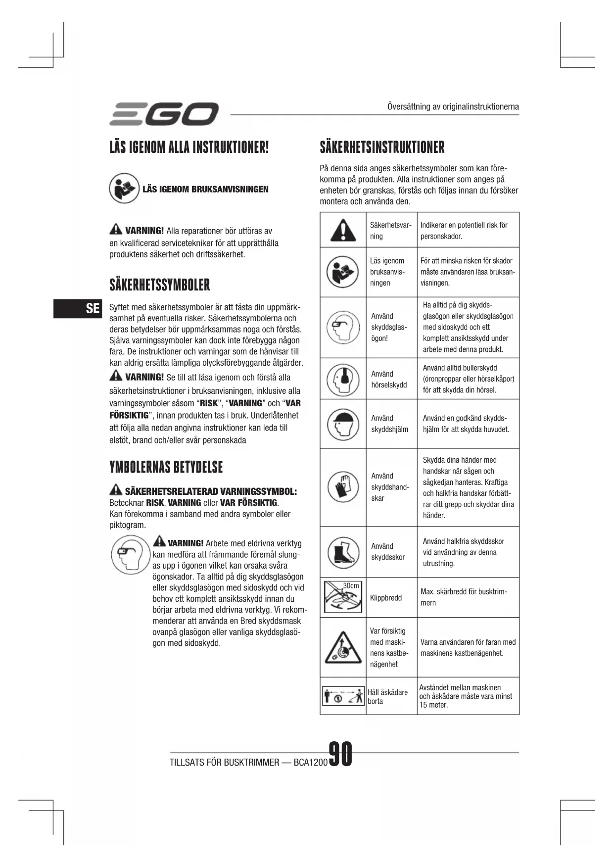 VARNING! Alla reparationer bör utföras av en kvalicerad servicetekniker för att upprätthålla produktens säkerhet och driftssäkerhet. SÄKERHETSSYMBOLER Syftet med säkerhetssymboler är att fästa din uppmärk- samhet på eventuella risker. Säkerhetssymbolerna och deras betydelser bör uppmärksammas noga och förstås. Själva varningssymboler kan dock inte förebygga någon fara. De instruktioner och varningar som de hänvisar till kan aldrig ersätta lämpliga olycksförebyggande åtgärder. VARNING! Se till att läsa igenom och förstå alla säkerhetsinstruktioner i bruksanvisningen, inklusive alla varningssymboler såsom “RISK”, “VARNING” och “VAR FÖRSIKTIG”, innan produkten tas i bruk. Underlåtenhet att följa alla nedan angivna instruktioner kan leda till elstöt, brand och/eller svår personskada YMBOLERNAS BETYDELSE SÄKERHETSRELATERAD VARNINGSSYMBOL: Betecknar RISK, VARNING eller VAR FÖRSIKTIG. Kan förekomma i samband med andra symboler eller piktogram. VARNING! Arbete med eldrivna verktyg kan medföra att främmande föremål slung- as upp i ögonen vilket kan orsaka svåra ögonskador. Ta alltid på dig skyddsglasögon eller skyddsglasögon med sidoskydd och vid behov ett komplett ansiktsskydd innan du börjar arbeta med eldrivna verktyg. Vi rekom- menderar att använda en Bred skyddsmask ovanpå glasögon eller vanliga skyddsglasö- gon med sidoskydd. SÄKERHETSINSTRUKTIONER På denna sida anges säkerhetssymboler som kan före- komma på produkten. Alla instruktioner som anges på enheten bör granskas, förstås och följas innan du försöker montera och använda den. Säkerhetsvar- ning Indikerar en potentiell risk för personskador.Läs igenom bruksanvis-ningenFör att minska risken för skador måste användaren läsa bruksan-visningen.Använd skyddsglas-ögon!Ha alltid på dig skydds-glasögon eller skyddsglasögon med sidoskydd och ett komplett ansiktsskydd under arbete med denna produkt.Använd hörselskyddAnvänd alltid bullerskydd (öronproppar eller hörselkåpor) för att skydda din hörsel.Använd skyddshjälmAnvänd en godkänd skydds-hjälm för att skydda huvudet.Använd skyddshand- skar Skydda dina händer med handskar när sågen och sågkedjan hanteras. Kraftiga och halkfria handskar förbätt-rar ditt grepp och skyddar dina händer.Använd skyddsskorAnvänd halkfria skyddsskor vid användning av denna utrustning. 30cm KlippbreddMax. skärbredd för busktrim- mern Var försiktig med maski-nens kastbe-nägenhetVarna användaren för faran med maskinens kastbenägenhet. Håll åskådare bortaAvståndet mellan maskinen och åskådare måste vara minst 15 meter. Översättning av originalinstruktionernaTILLSATS FÖR BUSKTRIMMER — BCA1200 91