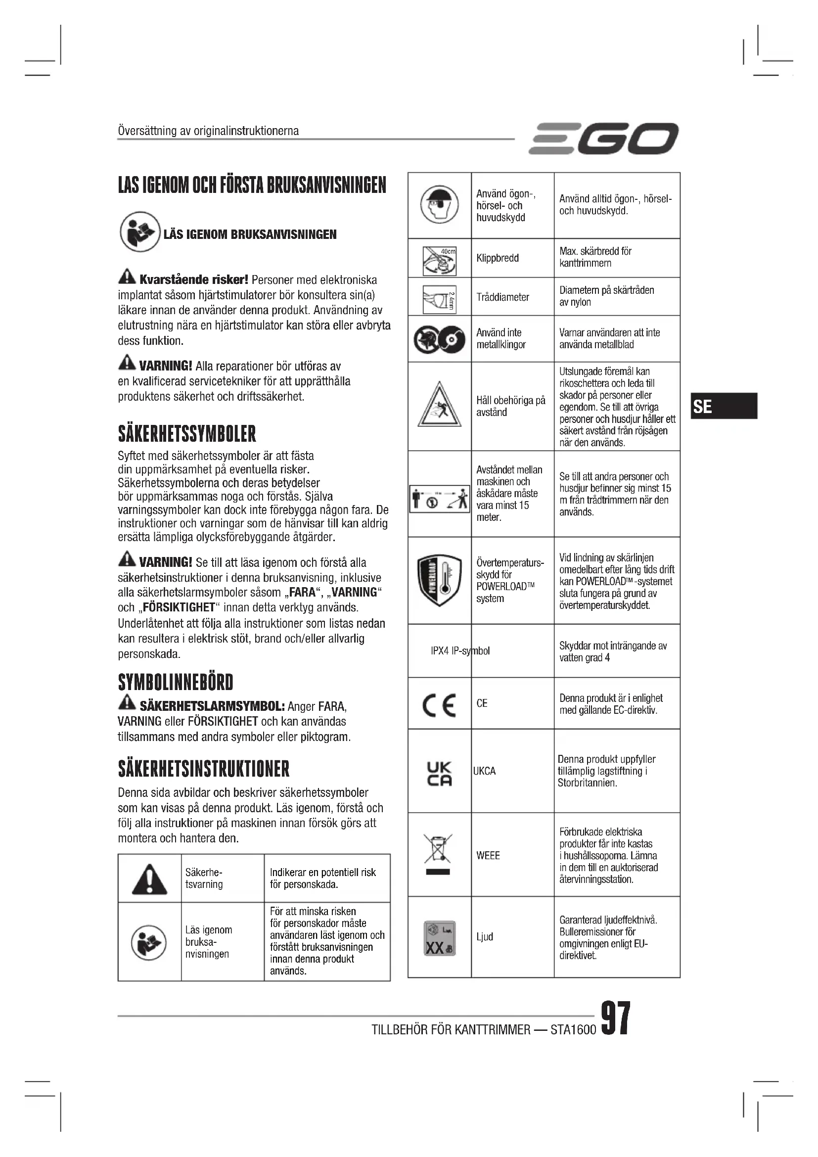 LÄS IGENOM BRUKSANVISNINGEN Kvarstående risker! Personer med elektroniska implantat såsom hjärtstimulatorer bör konsultera sin(a) läkare innan de använder denna produkt. Användning av elutrustning nära en hjärtstimulator kan störa eller avbryta dess funktion. VARNING! Alla reparationer bör utföras av en kvalicerad servicetekniker för att upprätthålla produktens säkerhet och driftssäkerhet. SÄKERHETSSYMBOLER Syftet med säkerhetssymboler är att fästa din uppmärksamhet på eventuella risker. Säkerhetssymbolerna och deras betydelser bör uppmärksammas noga och förstås. Själva varningssymboler kan dock inte förebygga någon fara. De instruktioner och varningar som de hänvisar till kan aldrig ersätta lämpliga olycksförebyggande åtgärder. VARNING! Se till att läsa igenom och förstå alla säkerhetsinstruktioner i denna bruksanvisning, inklusive alla säkerhetslarmsymboler såsom „FARA“, „VARNING“ och „FÖRSIKTIGHET“ innan detta verktyg används. Underlåtenhet att följa alla instruktioner som listas nedan kan resultera i elektrisk stöt, brand och/eller allvarlig personskada. SYMBOLINNEBÖRD SÄKERHETSLARMSYMBOL: Anger FARA, VARNING eller FÖRSIKTIGHET och kan användas tillsammans med andra symboler eller piktogram. SÄKERHETSINSTRUKTIONER Denna sida avbildar och beskriver säkerhetssymboler som kan visas på denna produkt. Läs igenom, förstå och följ alla instruktioner på maskinen innan försök görs att montera och hantera den.Säkerhe-tsvarningIndikerar en potentiell risk för personskada.Läs igenom bruksa-nvisningenFör att minska risken för personskador måste användaren läst igenom och förstått bruksanvisningen innan denna produkt används.Använd ögon-, hörsel- och huvudskyddAnvänd alltid ögon-, hörsel- och huvudskydd. 40cm KlippbreddMax. skärbredd för kanttrimmern 2.4mmTråddiameterDiametern på skärtråden av nylonAnvänd inte metallklingorVarnar användaren att inte använda metallblad Håll obehöriga på avståndUtslungade föremål kan rikoschettera och leda till skador på personer eller egendom. Se till att övriga personer och husdjur håller ett säkert avstånd från röjsågen när den används.Avståndet mellan maskinen och åskådare måste vara minst 15 meter.Se till att andra personer och husdjur benner sig minst 15 m från trådtrimmern när den används.Övertemperaturs-skydd för POWERLOAD